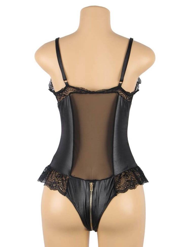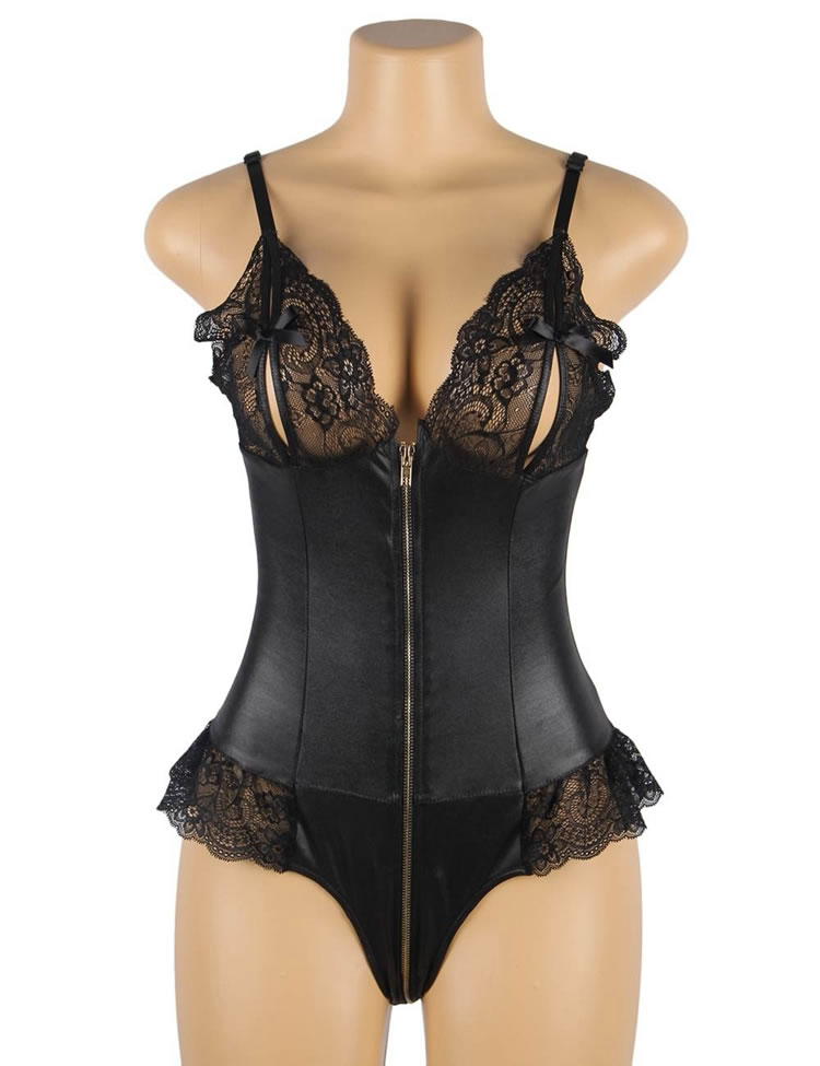 Aim to please in this ultra seductive plus size teddy featuring sheer lace peek-a-boo cups with satin bow accents, adjustable spaghetti straps, an exposed gold front zipper that wraps around to the back, a faux leather bodice, a ruffled lace hem, a mesh back panel, and a cheeky cut bottom.
