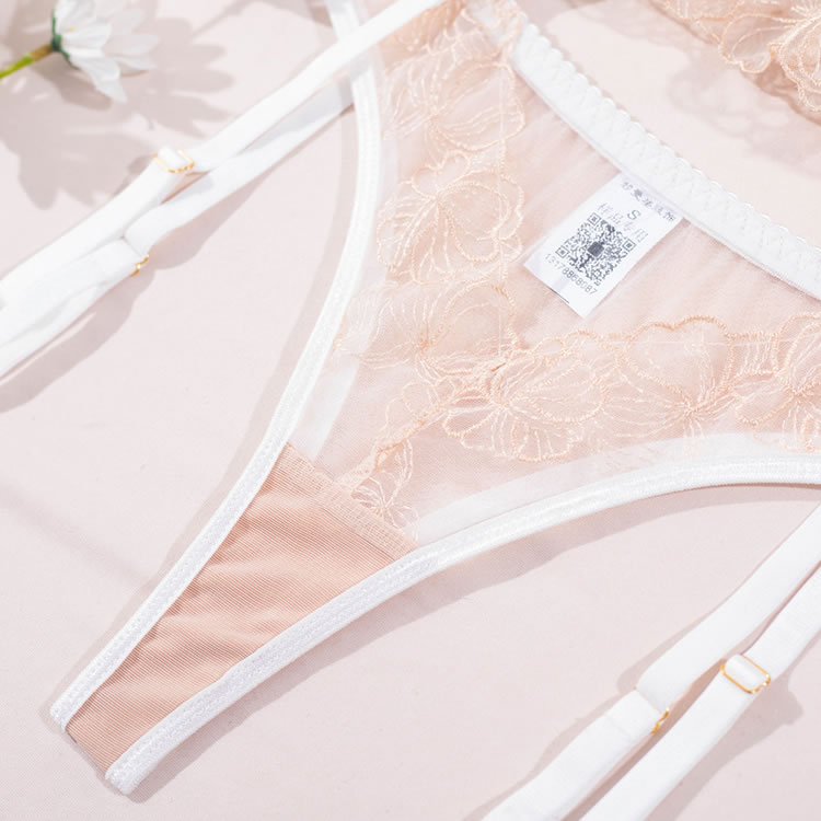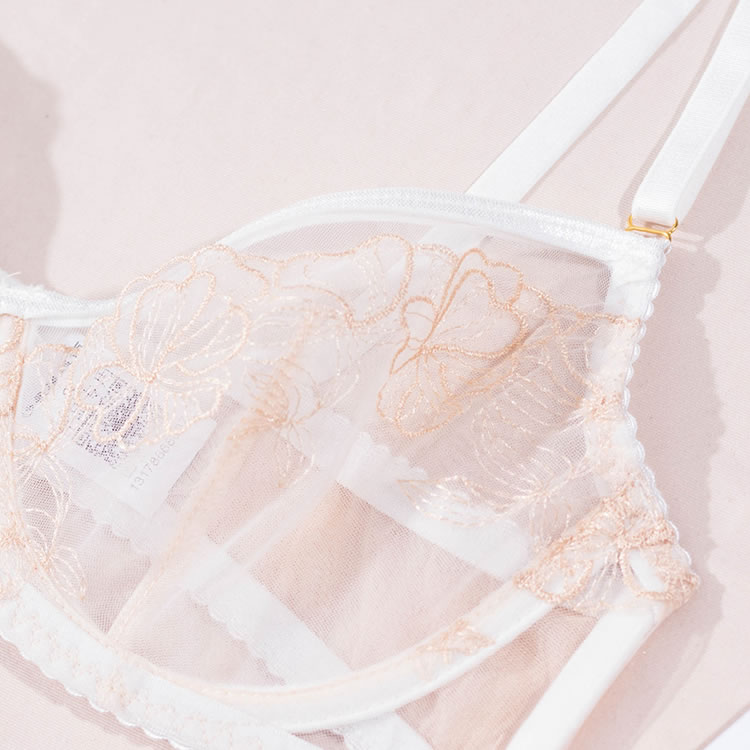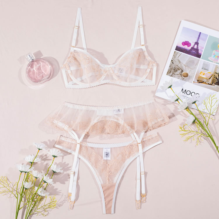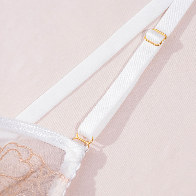 Embrace timeless elegance with this exquisite white lingerie set. The delicate underwire bra is crafted from sheer floral lace, offering a romantic and feminine silhouette. It pairs perfectly with the matching high-waisted garter briefs, which feature a beautiful scalloped lace waistband and a flirty ruffled overlay. Adjustable garter straps add a classic, sophisticated touch, making this set perfect for a special occasion.