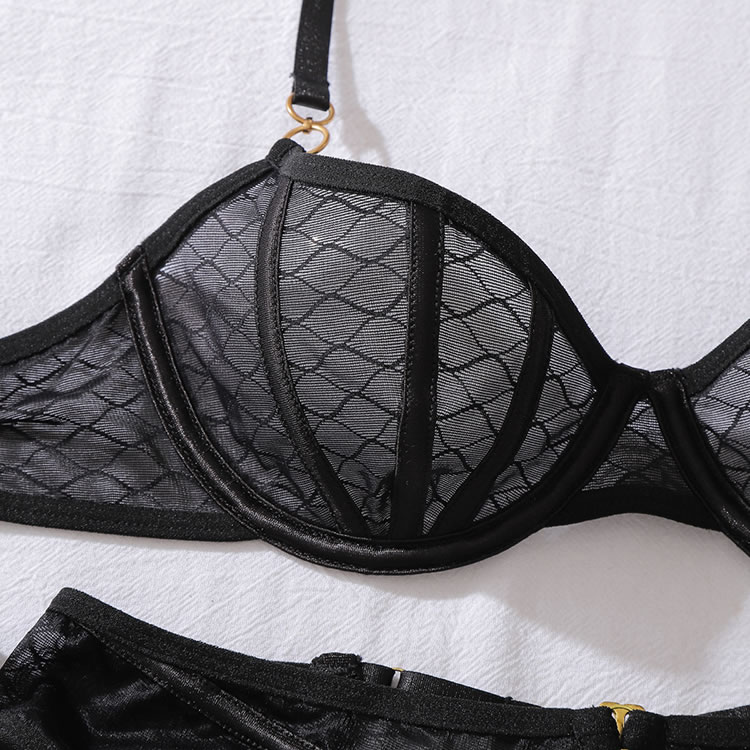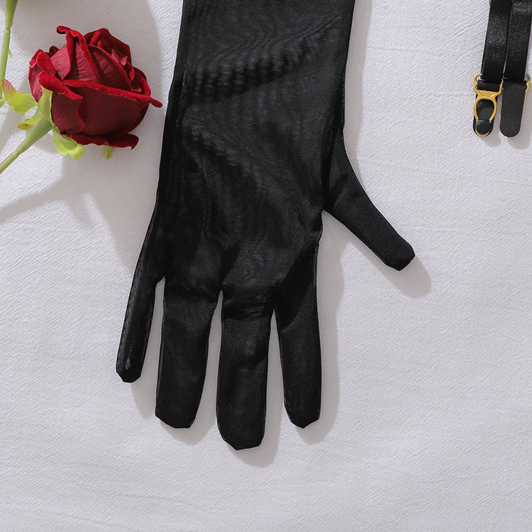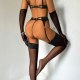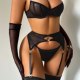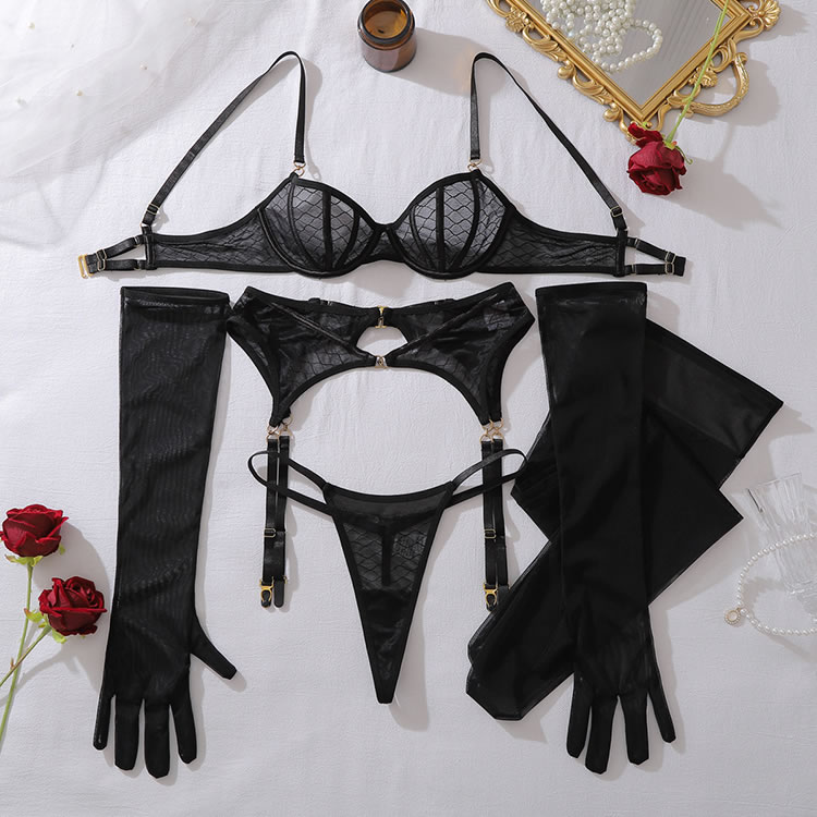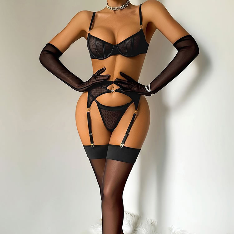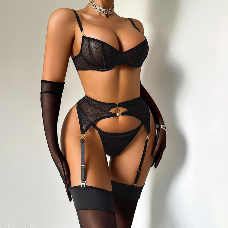 Unleash your inner vixen with this bold 5-piece black lingerie set. The design features a striking geometric mesh pattern on the underwire bra and matching high-waisted garter belt, which connects to sheer thigh-high stockings with gold-tone clips. The set includes a thong and a pair of elegant, sheer opera-length gloves, adding a touch of mystery and sophistication. Perfect for those who want to make a statement with a complete, coordinated look that combines edgy style with classic allure.