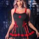This bold nurse-inspired costume combines edgy style with classic charm. The black dress features red-trimmed straps and a flirty ruffled skirt layered with tulle for added volume and flair. Adjustable ribbon ties on the sides allow for a customized fit, while the red cross emblem on the chest adds a signature touch. Paired with a matching cap, this outfit brings a fun twist to the traditional nurse look — perfect for Halloween, parties, or role play.