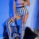 Step into a world of contrast and drama with this eye-catching black-and-white lingerie set featuring a halter-style triangle top with a crisscross waistband, high-waisted shorts, and mismatched thigh-high stockings. One leg showcases bold vertical stripes, while the other features a classic checkerboard pattern, creating a striking visual effect. Perfect for Halloween, cosplay, or edgy fashion moments, this outfit blends playful design with a daring silhouette.