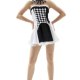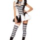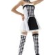 Make a bold statement with this playful yet edgy jester-themed costume that blends classic carnival style with modern flair. The strapless bodice features a striking black and white checkered pattern, cinched at the waist to highlight the silhouette. A short flared skirt with ruffled trim adds movement, while matching checkered thigh-highs and a bow tie complete the look. Paired with a dramatic mask, it’s perfect for Halloween, themed parties, or cosplay events where fun and attitude take center stage.