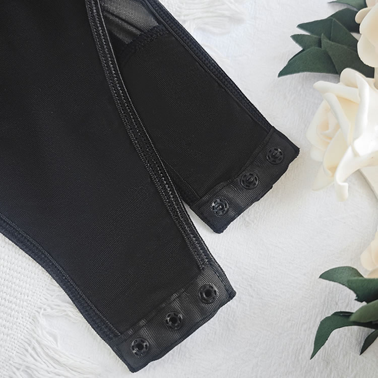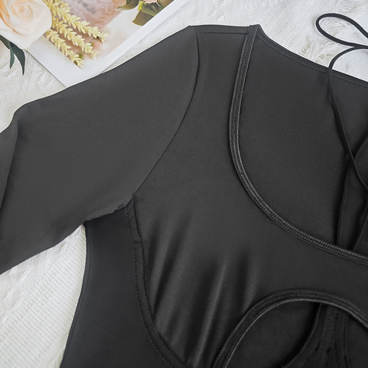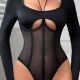 This black bodysuit features a bold cutout design at the bust with dual oval openings that create a striking visual contrast against the solid fabric. The long sleeves offer full coverage, while the front is shaped with vertical mesh panels that add texture and depth. A square neckline frames the collarbone, and the back includes a delicate tie detail at the nape of the neck for an adjustable fit. Designed with a snug, form-fitting silhouette and high-cut leg openings, this one-piece makes a confident statement.