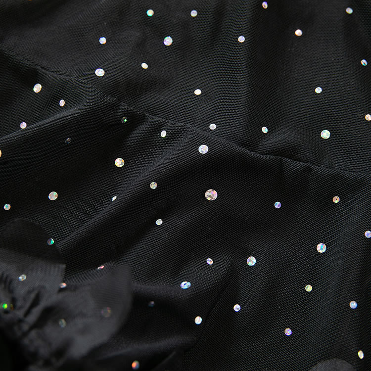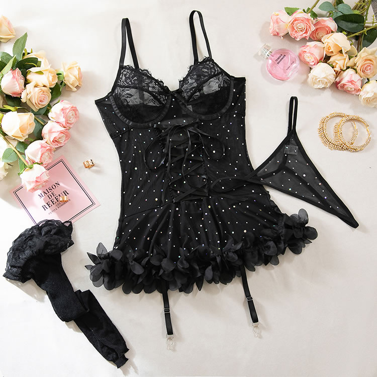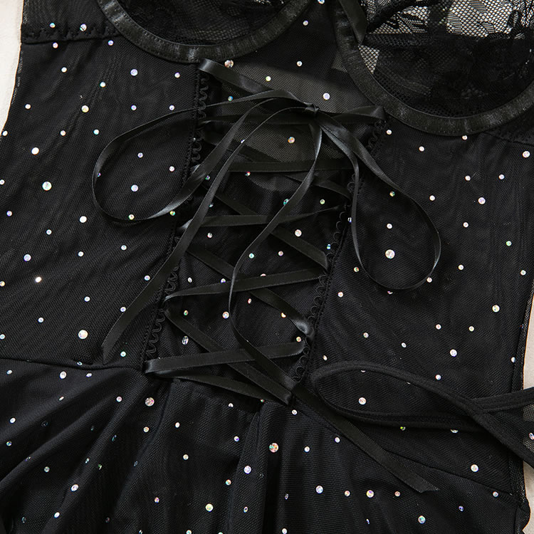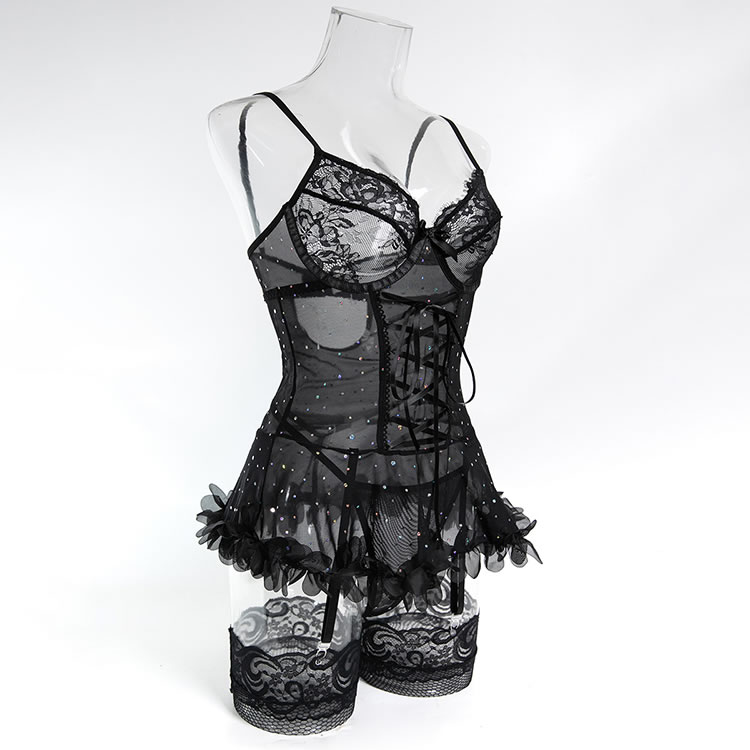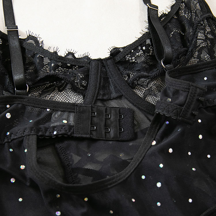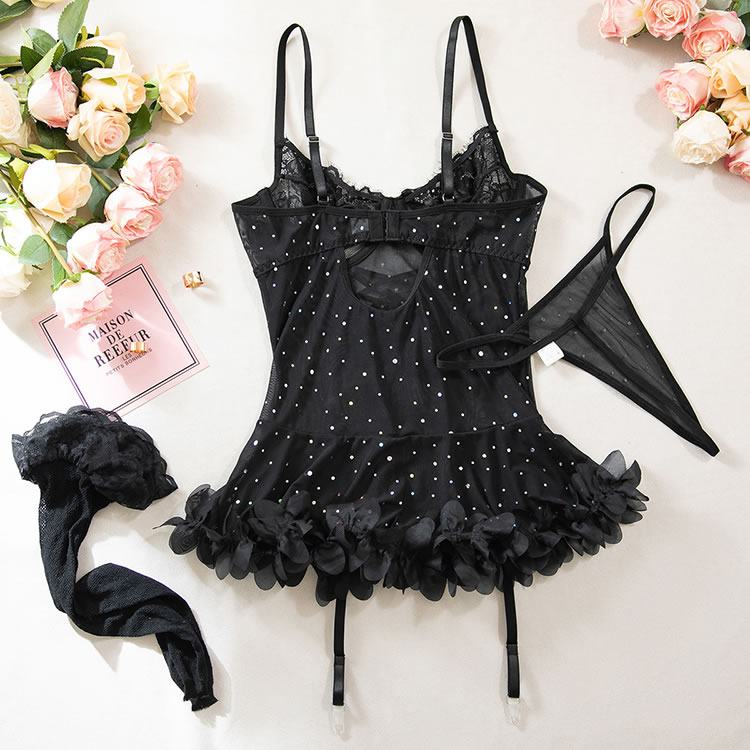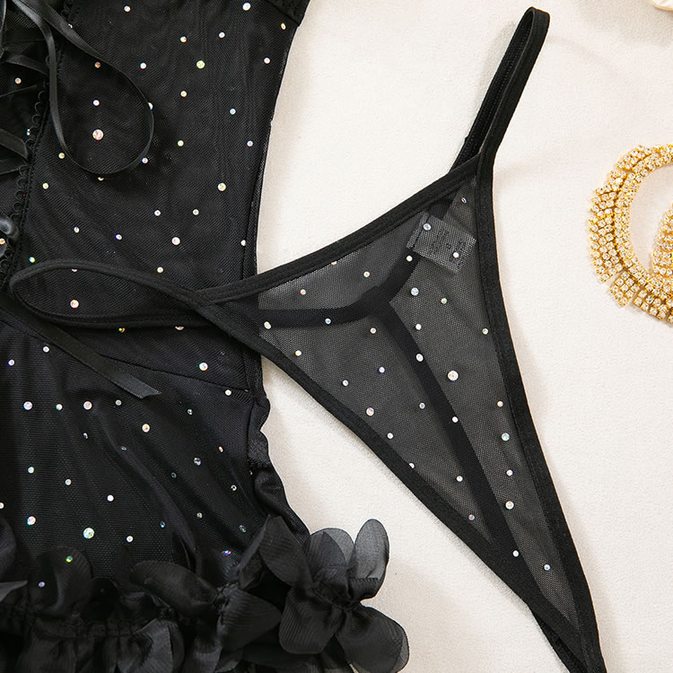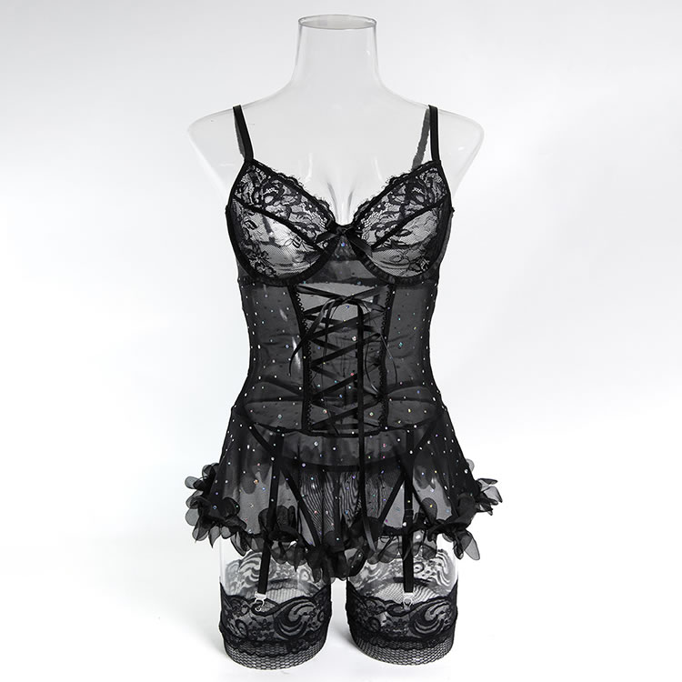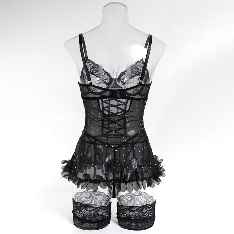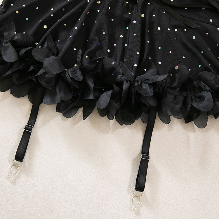 This black lingerie set features a corset-style bodysuit with sheer mesh panels and small dot details across the torso. The top includes lace trim along the bust and a flared ruffle hem that adds a playful touch. Adjustable garter straps attach to matching lace-trimmed thigh bands, designed to hold fishnet stockings securely. The back showcases an open cutout with a central clasp, enhancing the silhouette. Paired with fishnet tights, this ensemble offers a bold and dramatic look perfect for intimate occasions.