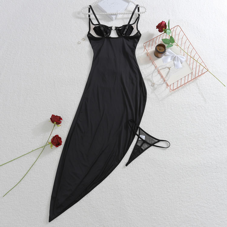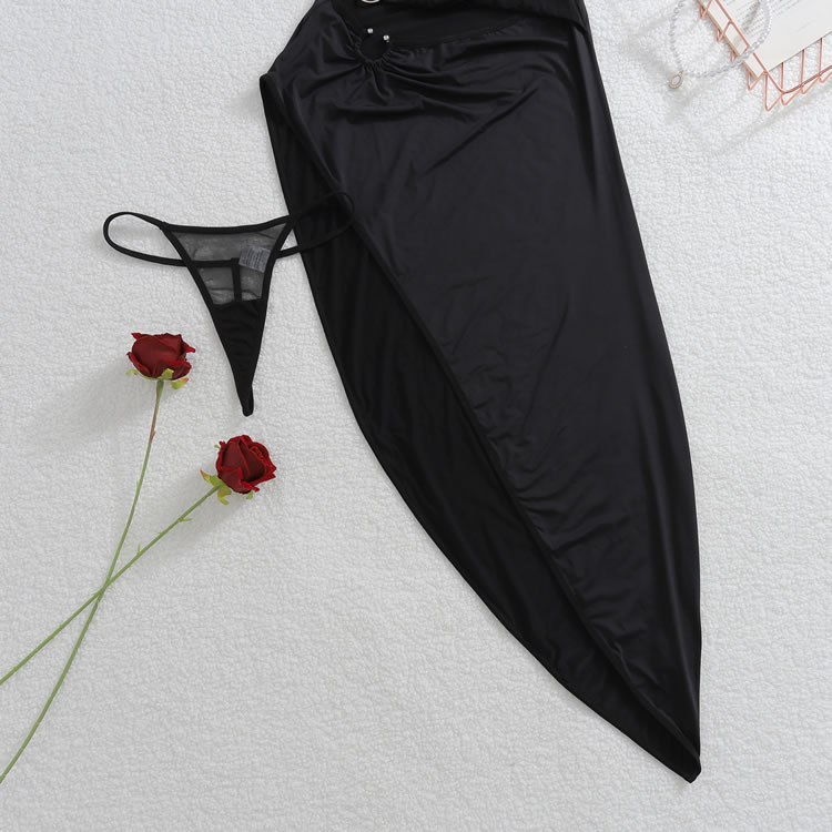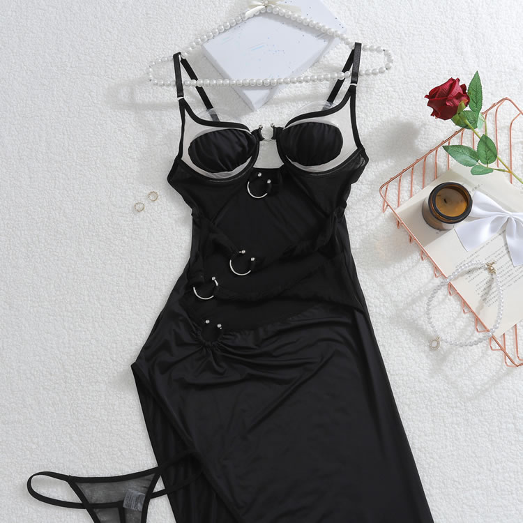 This daring one-piece lingerie set blends edgy hardware details with a flowing silhouette for a look that’s both bold and elegant. The bra features deep cleavage support with multiple horizontal cut-outs and metallic rings that add a touch of industrial flair. A high-waisted, asymmetrical skirt that drapes dramatically from one side, it creates a striking contrast between structure and movement—perfect for those who love to make a statement in intimate wear.