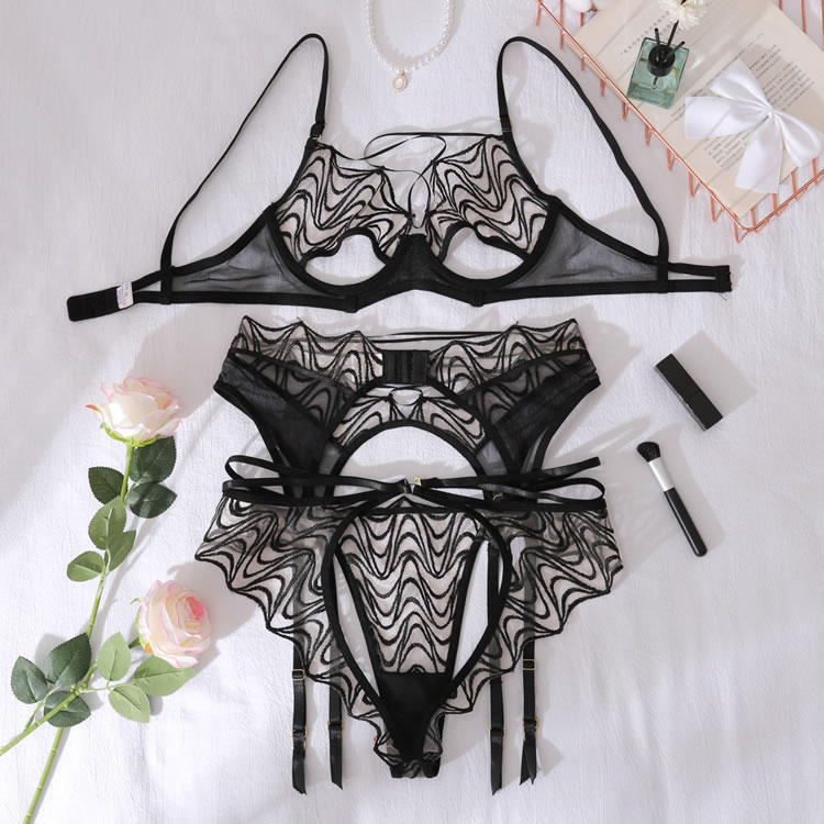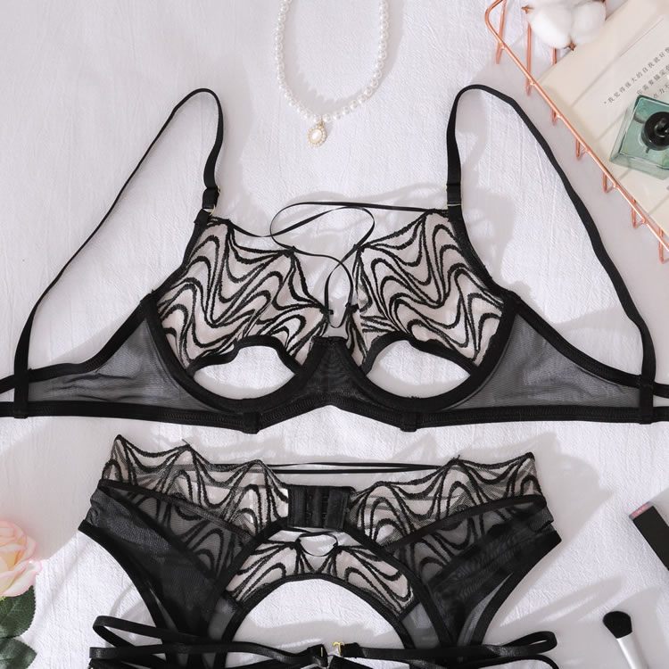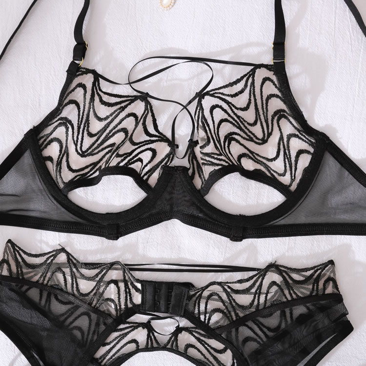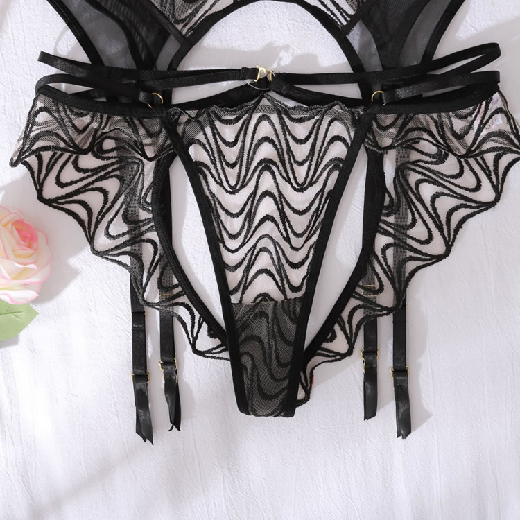 This striking lingerie set commands attention with its bold geometric cut-outs and sheer mesh fabric. The bra features a crisscross front design that enhances shape and adds visual intrigue, while the matching high-waisted garter belt with garter straps, briefs include a dramatic open back for a sultry, edgy look. Designed to highlight curves with confidence, it’s perfect for those who love bold fashion with a rebellious edge.