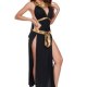 Step into a world of ancient allure with this striking black Egyptian-inspired costume, featuring a deep V-neckline and bold gold accents that highlight the dramatic silhouette. The high side slit adds movement and confidence, while the flowing fabric drapes elegantly from the halter neckline to the floor. Designed for theatrical impact, this outfit includes a decorative belt and matching headpiece to complete the powerful look—perfect for Halloween, cosplay, or themed events.