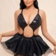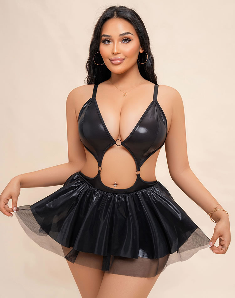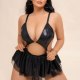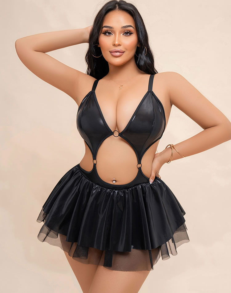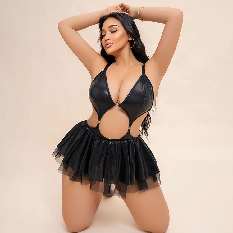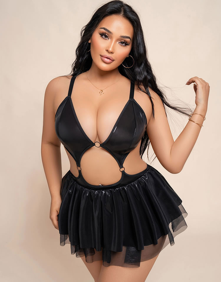 Make a statement in this edgy black chemise featuring shiny faux leather panels and daring side cutouts framed with O-tone rings. The deep V-neckline enhances your curves, while the layered tulle skirt adds playful movement without sacrificing coverage. Adjustable straps and back closure ensure a secure, customizable fit. Perfect for themed nights, photoshoots, or whenever you want to feel powerful and sexy — exactly as you are.