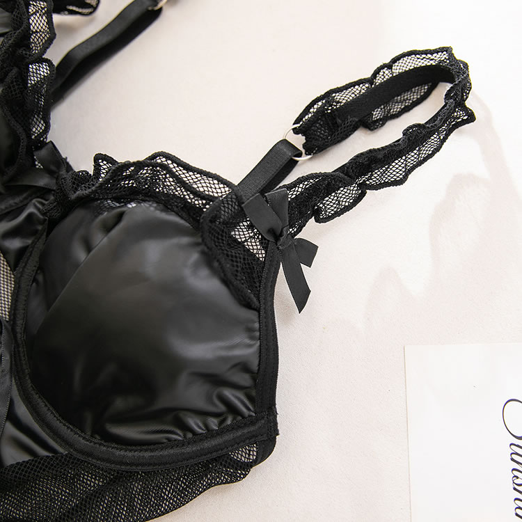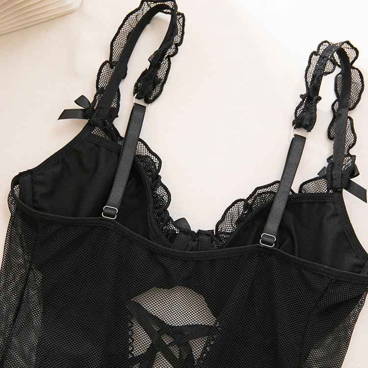 This chemises masterfully blends gothic allure with romantic details. The bust features molded faux leather cups trimmed with delicate lace, creating a striking silhouette. The waist is cinched with a faux leather corset panel, complete with a dramatic lace-up front that adds an edgy, vintage touch. The sheer mesh body flows into a ruffled babydoll hem, while attached garter straps connect to fishnet stockings for a complete, captivating look.