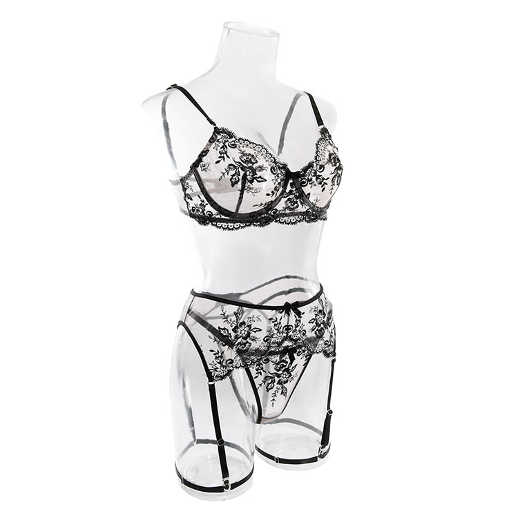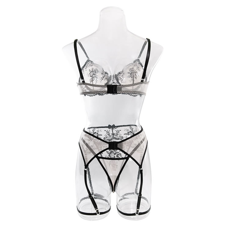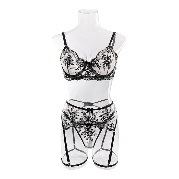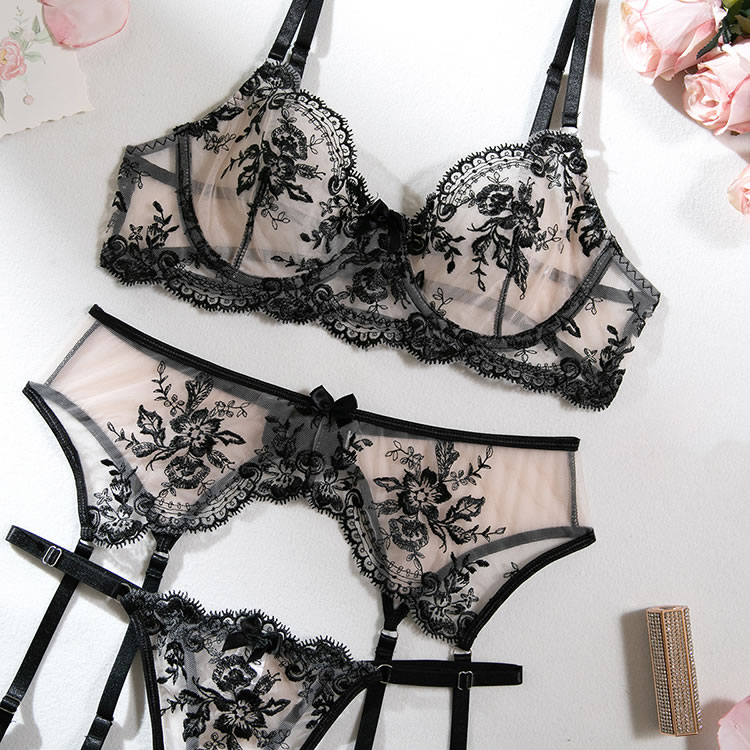 Embrace the allure of this black lace lingerie set, which combines sophistication with a playful edge. The bra showcases an elaborate floral design, complemented by a central bow, while the garter belt and panties feature stylish straps. Crafted from soft, breathable lace, this set ensures both comfort and style, making it ideal for special occasions or everyday wear.