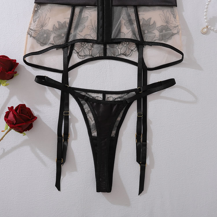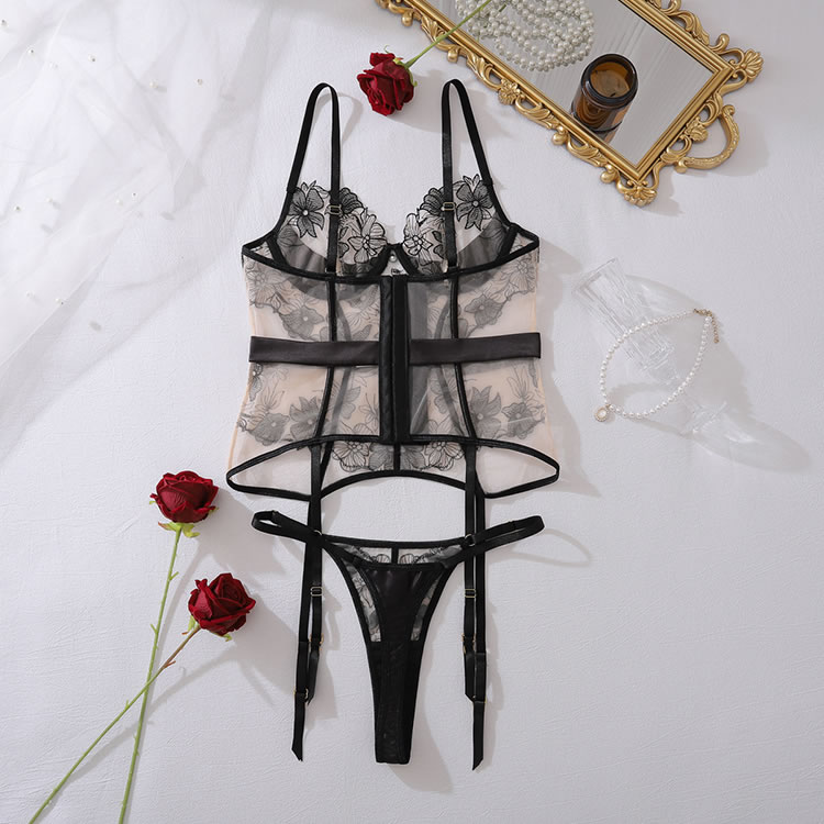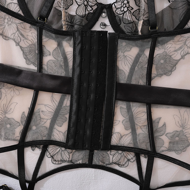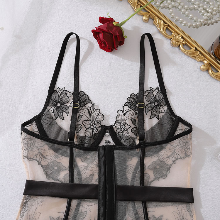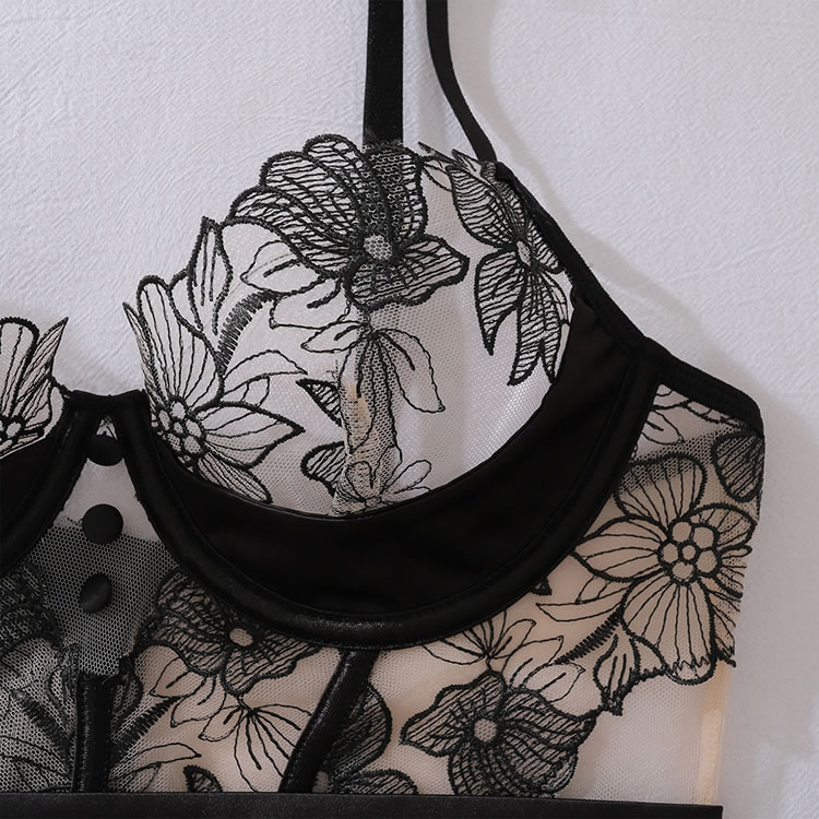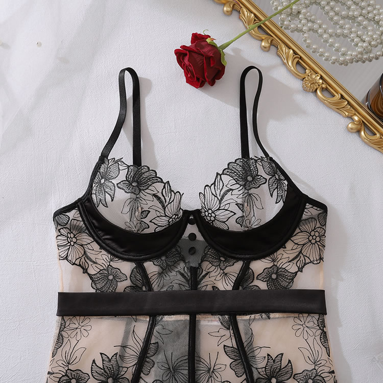 This exquisite black chemises is a masterpiece of intricate design and alluring details. It features a stunning floral lace pattern over a sheer mesh base, creating a beautiful contrast that is both romantic and daring. The chemises is structured with underwire cups for support and shaping, while the waist-cinching panel details create a flattering silhouette. Complete with adjustable garter straps for your favorite stockings, this piece is designed to make a captivating statement.