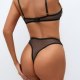 This elegant lingerie costume combines soft transparency with intricate detailing for a timeless look. The bra features a classic underwire shape with sheer mesh panels adorned by black floral vine embroidery across the cups. Thin adjustable straps end in small bows, adding a touch of romance to the design. The matching high-cut thong includes a central panel of embroidered lace framed by solid edges, creating a balanced contrast between opacity and see-through texture. Designed to highlight natural curves, this set is ideal for intimate moments or fashion-forward occasions.