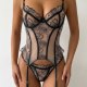 Unleash your inner seductress with this black floral lace chemise. This piece features a sheer mesh base adorned with intricate floral lace patterns and finished with soft satin-like trim along the edges. The design includes a deep sweetheart neckline and adjustable spaghetti straps for a comfortable, customizable fit. The chemise is styled with attached garter straps that hold sheer thigh-high stockings, adding a vintage-inspired touch. The open crotch design offers a daring element, while the back features a sleek, open silhouette that highlights the natural curves of the body.