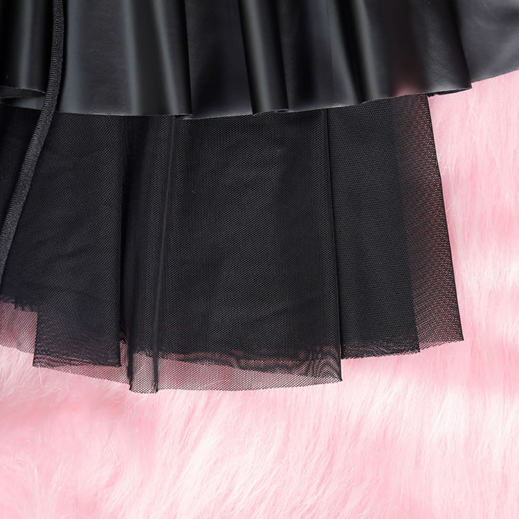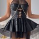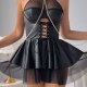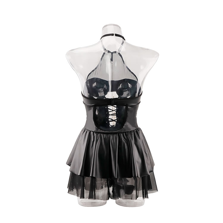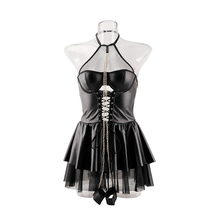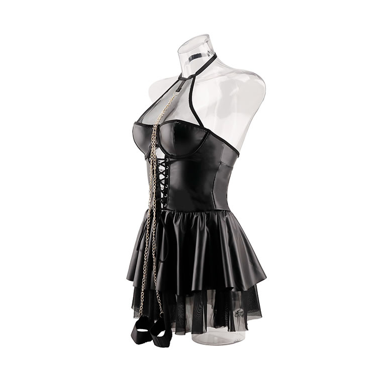 This bold black lingerie dress blends a playful silhouette with edgy details. Featuring a halter-style neckline, sheer mesh panels, and a structured bustier top with front lace-up detailing, it offers both support and flair. The flared skirt combines smooth fabric with layered tulle for movement, while the back cutout adds a daring touch. Paired with matching wrist cuffs and a gold chain accent, this piece is designed to stand out in any setting.