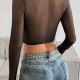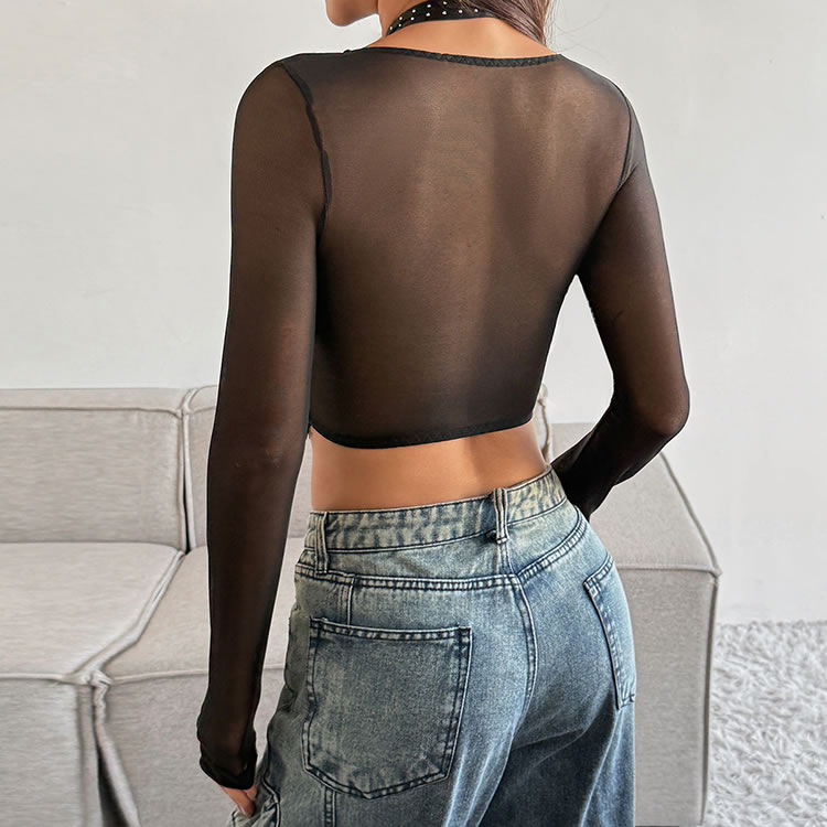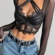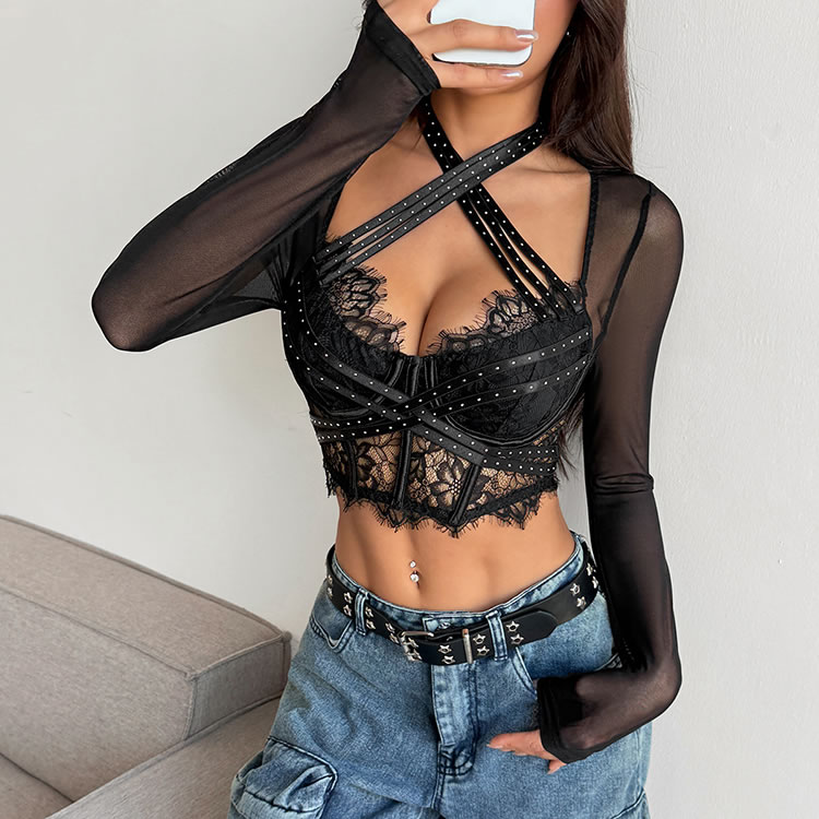 This edgy top masterfully blends delicate and bold elements for a striking look. It features a sheer mesh body with long sleeves, layered over an intricate black lace bustier. The design is highlighted by multiple straps that crisscross over the chest and wrap around the neck in a halter style, adding a touch of rebellious flair. The cropped length and scalloped lace hem make it a perfect choice for pairing with high-waisted jeans or skirts for a night out.