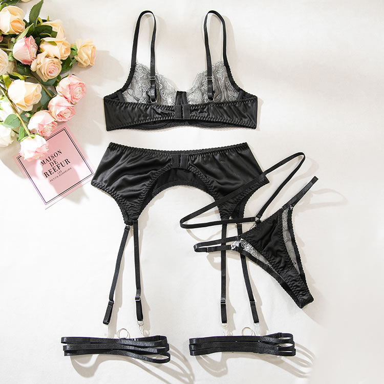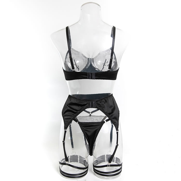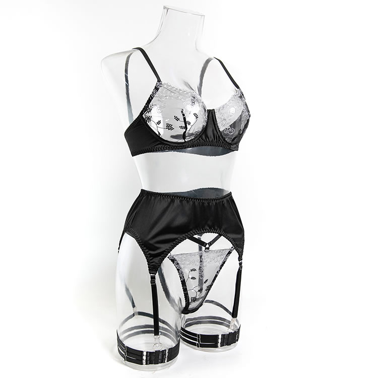 This bold lingerie set features a sheer lace bra with intricate floral patterns and scalloped edges, offering both structure and delicate detailing. The matching high-waisted garter belt includes adjustable straps that attach to thigh bands, creating a classic yet daring look. A central cutout in the front of the garter adds a modern touch, while the back showcases a wide band connecting the top and bottom for support. Designed to highlight curves, this set combines vintage inspiration with contemporary styling.