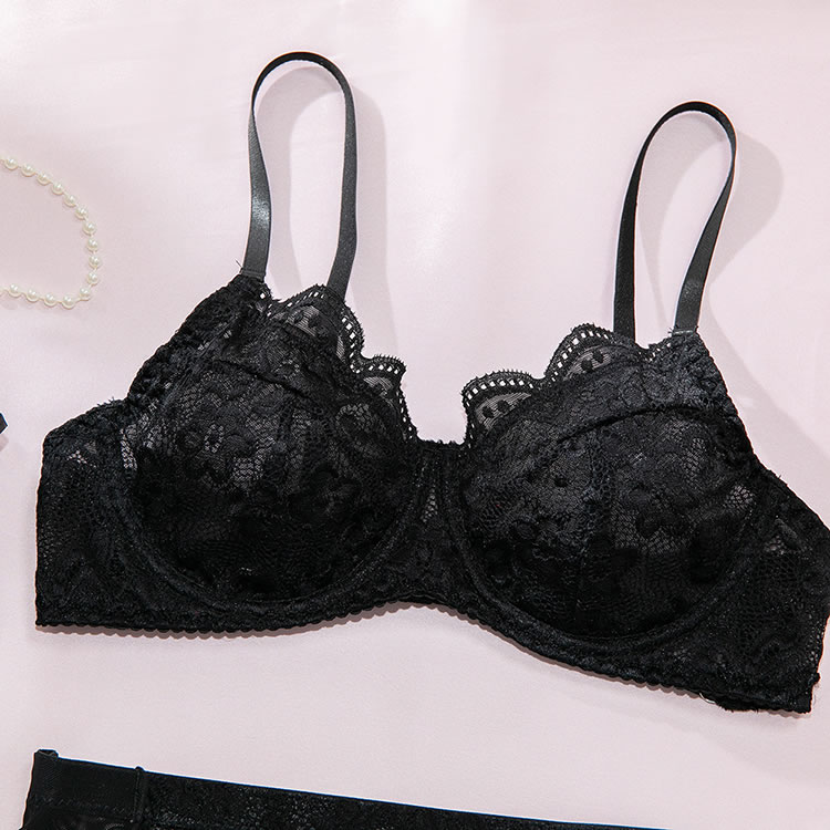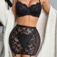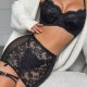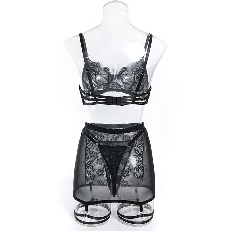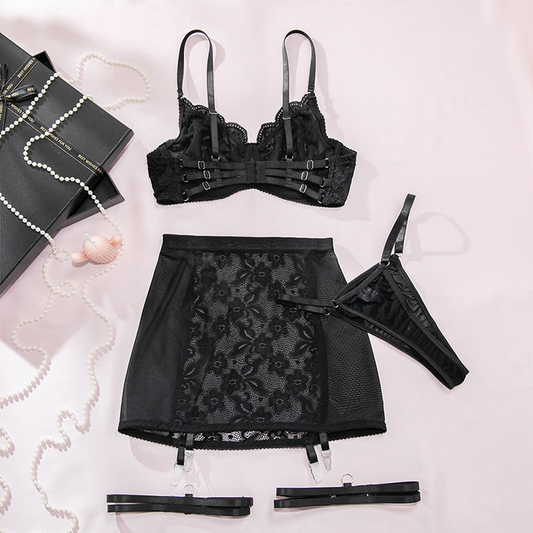 This bold black lingerie set features a structured lace bra with scalloped edges and a high-waisted mesh skirt that hugs the curves perfectly. The sheer paneling and floral lace detailing add depth and texture, while the attached garter straps offer both function and flair. Designed to enhance your silhouette, it’s ideal for those who love a mix of elegance and edge in their intimate wear.