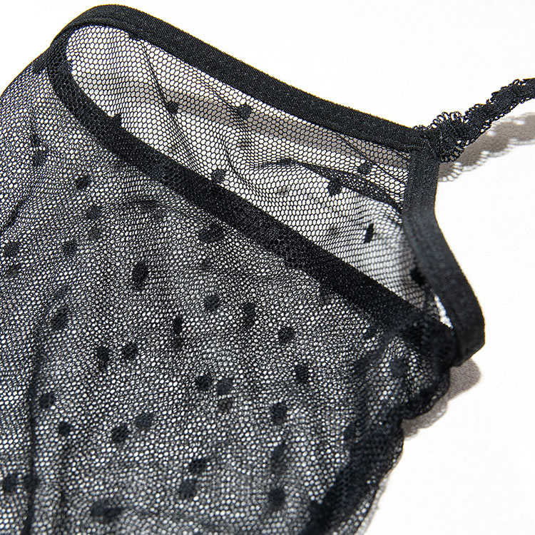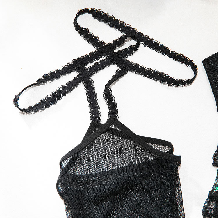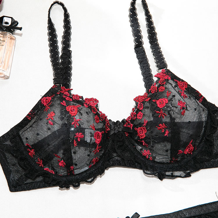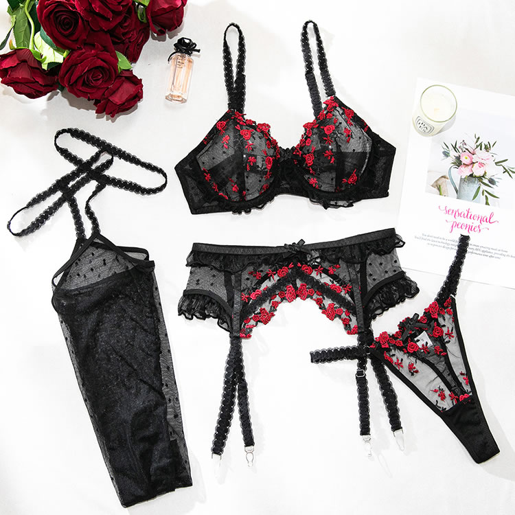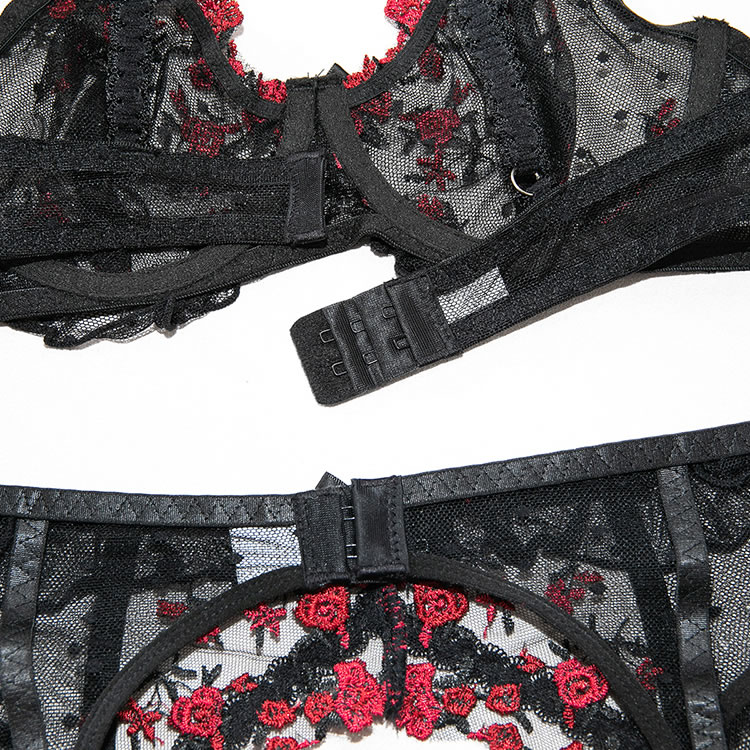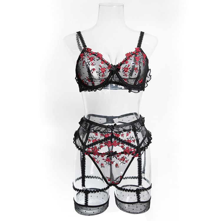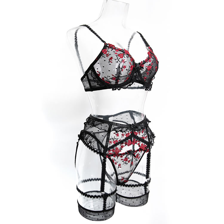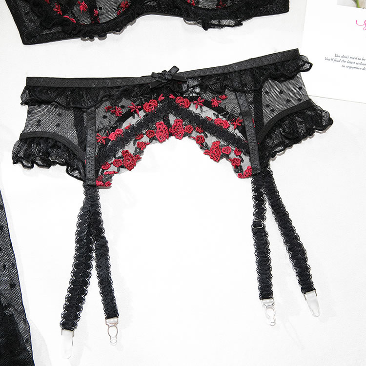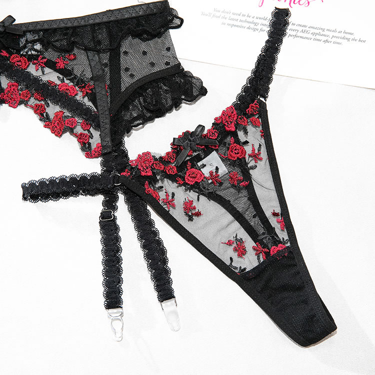 This black lingerie set features a delicate floral lace design with red rose embroidery that adds a bold pop of color. The bra has a structured silhouette with thin straps and scalloped edges, while the matching high-cut garter belt include garter straps for holding fishnet stockings in place. Designed to enhance curves with a classic yet daring look, it’s perfect for those who love romantic details with a touch of edge.