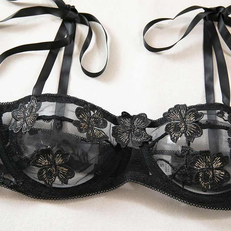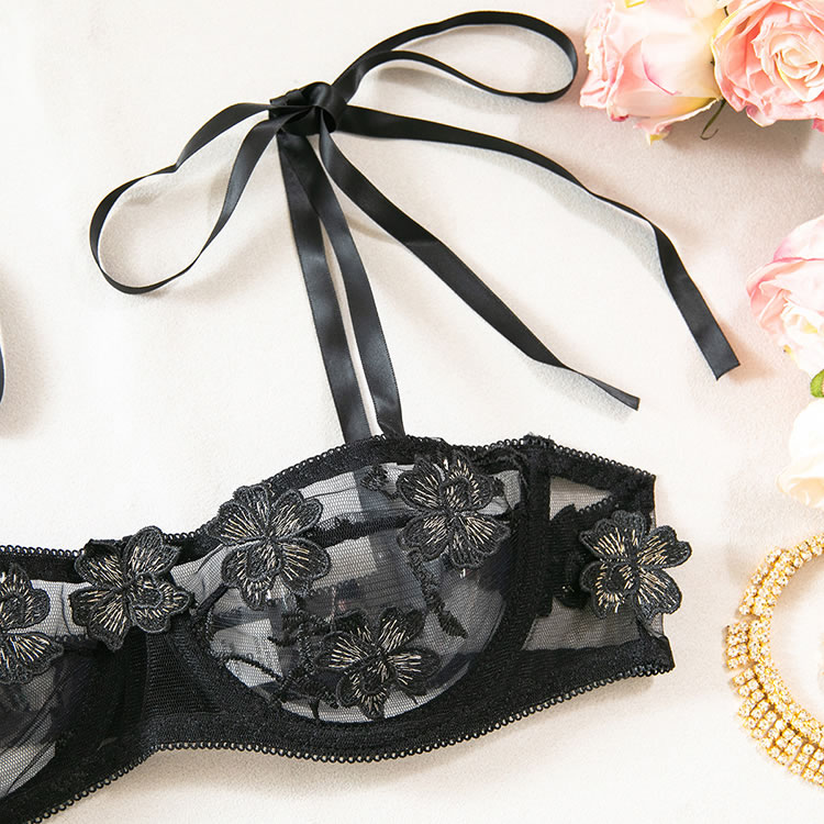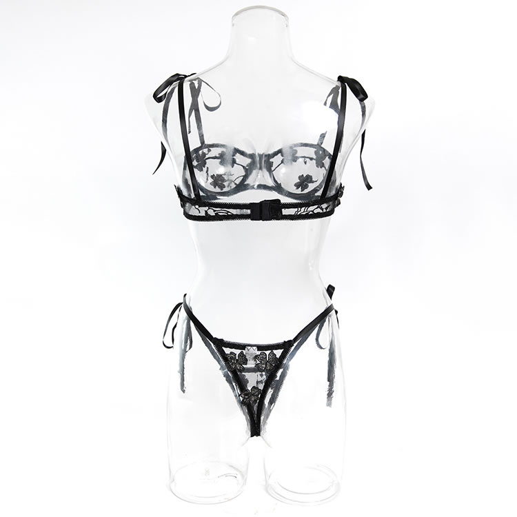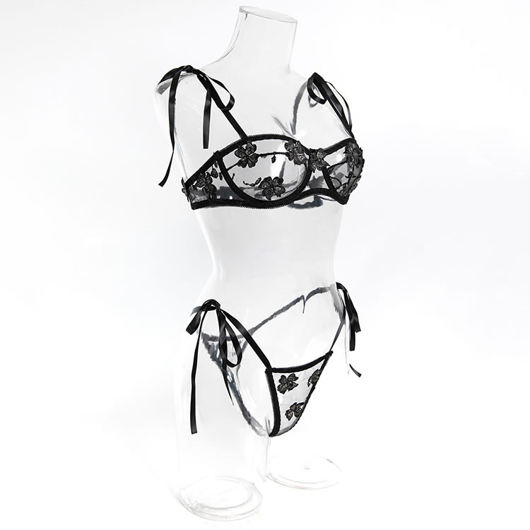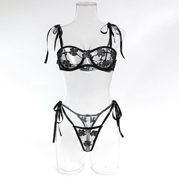 This black lace lingerie set features a delicate floral pattern across both the bra and thong, adding a romantic touch to its bold silhouette. The bra has adjustable tie straps that sit gracefully on the shoulders, while the front offers a sheer mesh design with embroidered details. The matching thong includes side ties that can be adjusted for fit and style, enhancing the overall shape. With a low back and open design, this set highlights natural curves and offers a soft yet daring look.