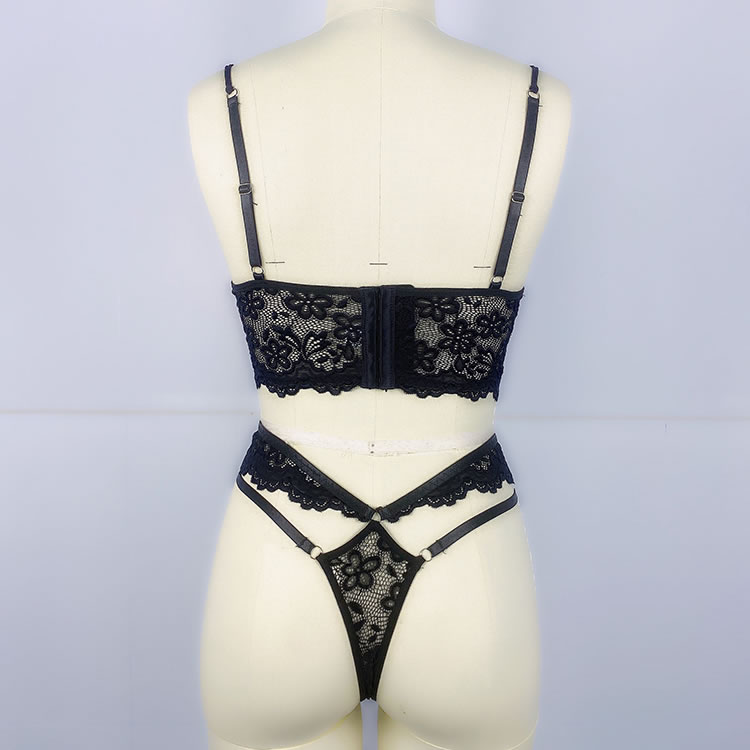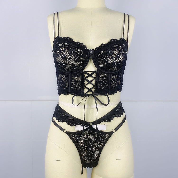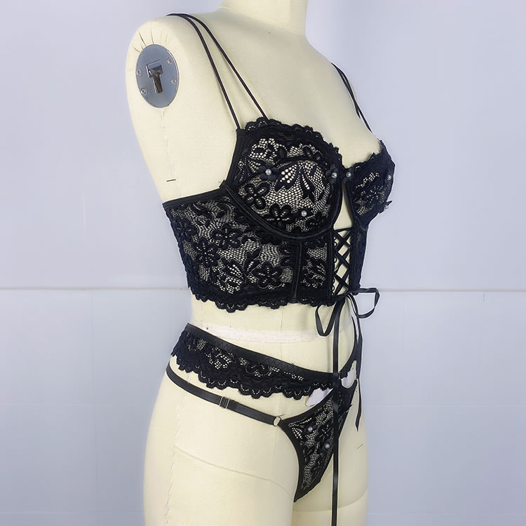 This bold black lingerie set features a structured bra with intricate lace detailing and a front lace-up design that adds a daring touch. The cups are adorned with small embellishments and floral lace patterns, while thin adjustable straps provide support and a customizable fit. The matching thong-style panties have a wide waistband with lace trim and a cut-out design that enhances the natural curves. With a sleek back closure and open midriff, this set is made for those who love a mix of edgy elegance and confidence.