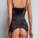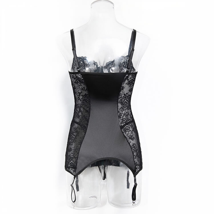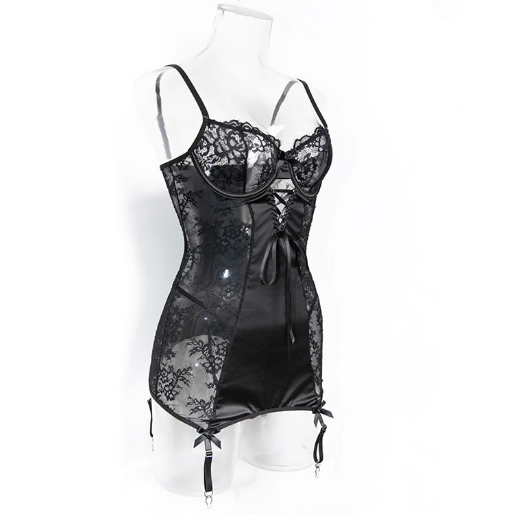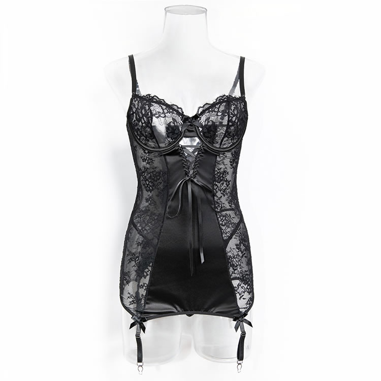 This sleek black chemises blends structured form with delicate lace detailing for a striking contrast. The front features a corset-style lace-up panel that accentuates the waist, while floral lace overlays frame the bust and hips. Thin spaghetti straps support the top, and the back is designed with a smooth, seamless finish for clean lines. Attached garter straps extend from the sides, adding a classic touch of romance. Perfect for those who love a fusion of modern fit and timeless charm.