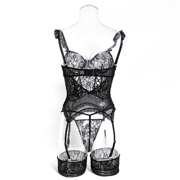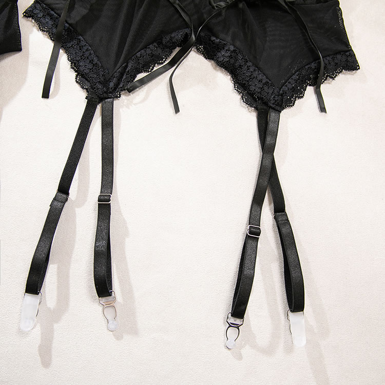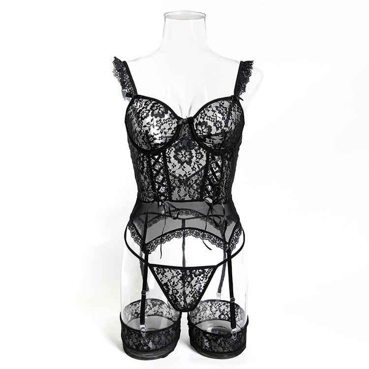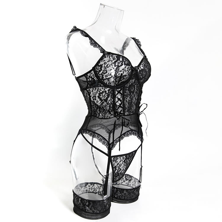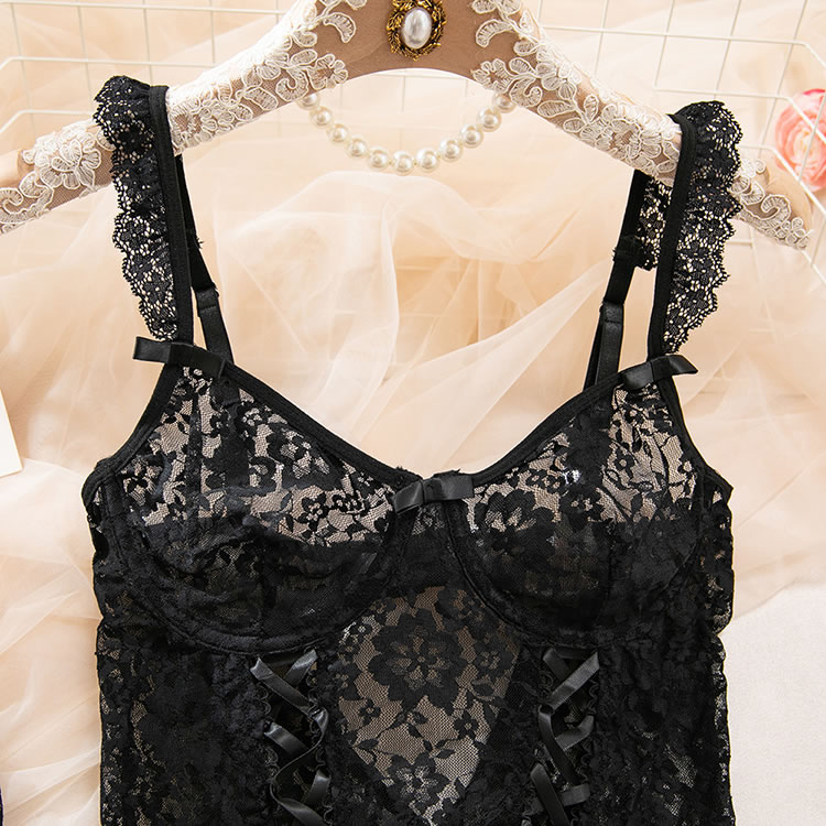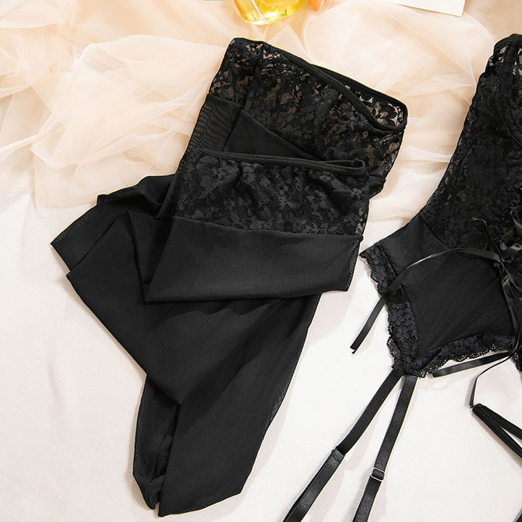 This black lace chemises combines a structured silhouette with bold cutout details for a striking look. The top features a full-coverage bra with underwire support, adorned with intricate lace patterns and a central criss-cross lacing panel that adds shape and drama. The midsection includes sheer mesh panels and a high-cut waistband that connects to adjustable garter straps, designed to hold thigh-high stockings securely. With a flirty open back and delicate trim, it’s perfect for those who love vintage-inspired, edgy styles.