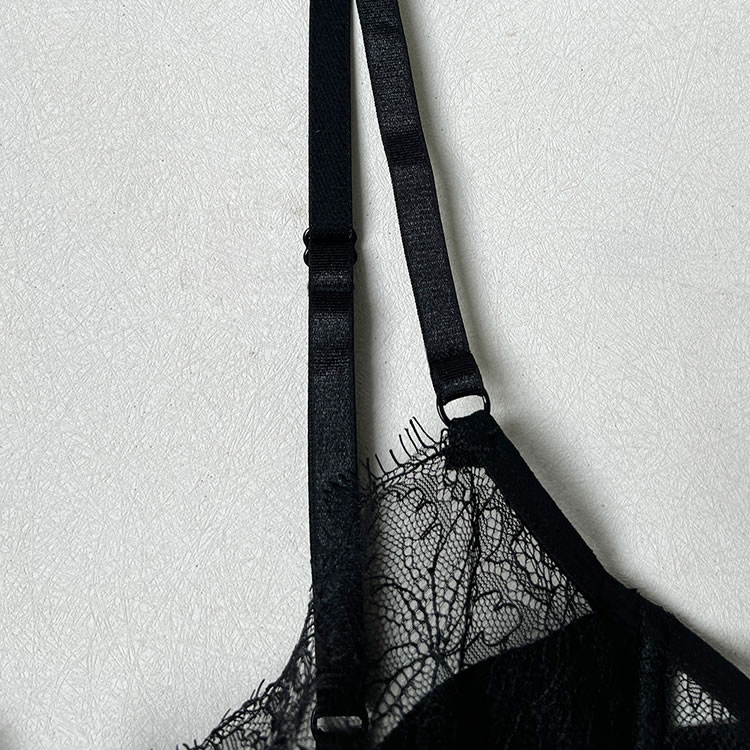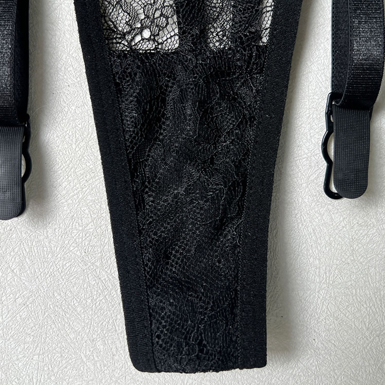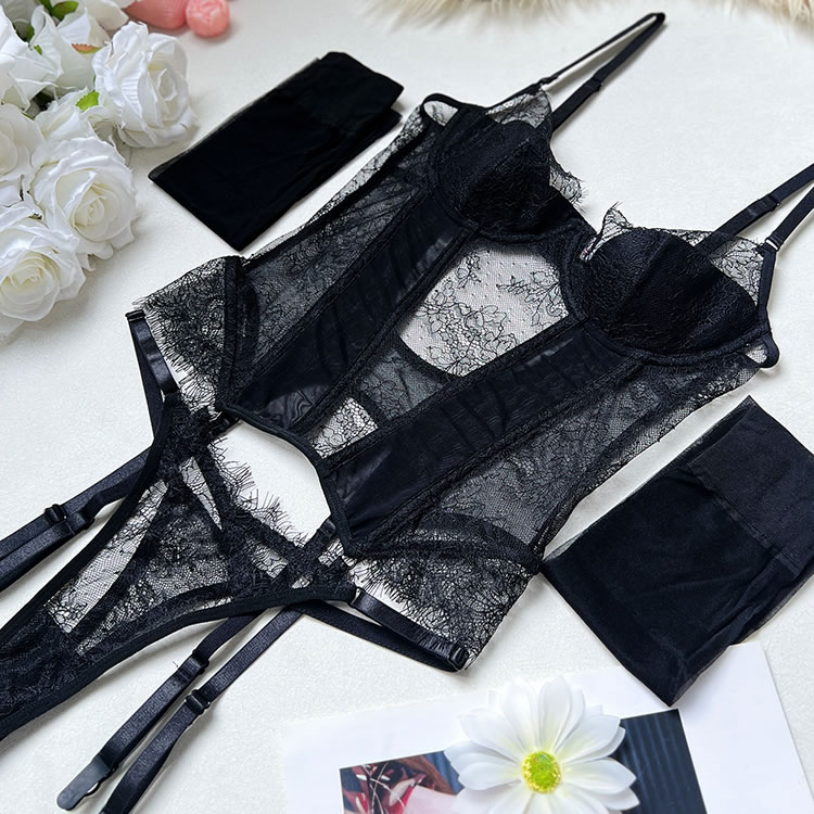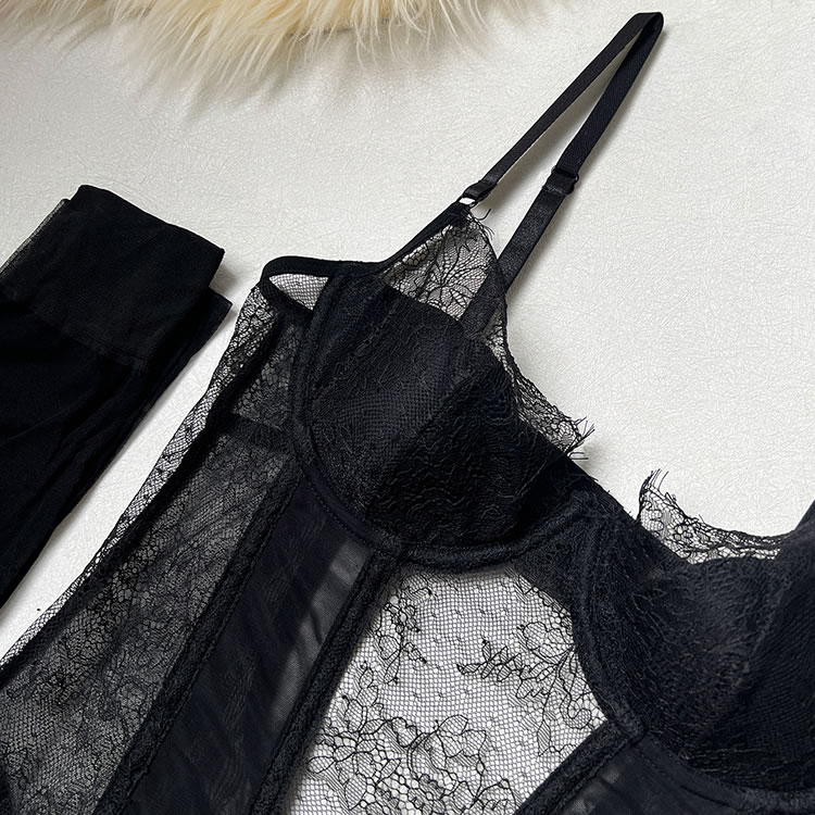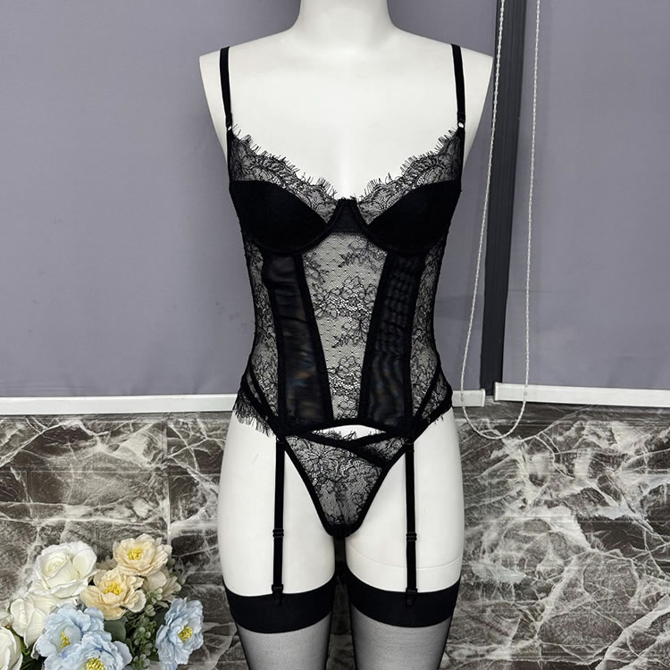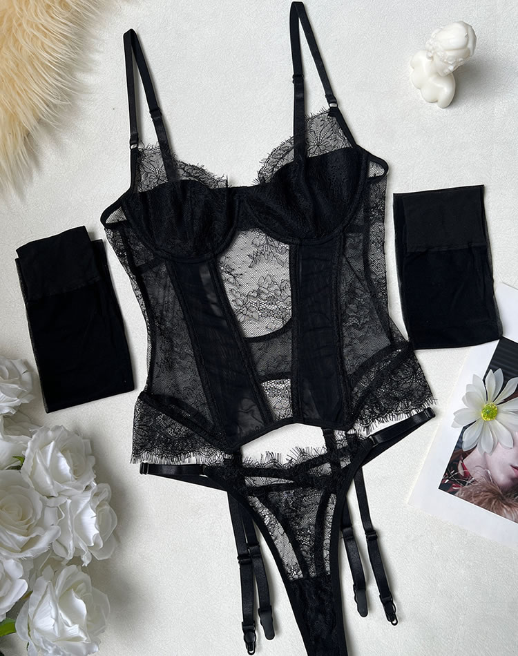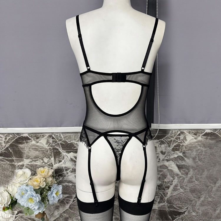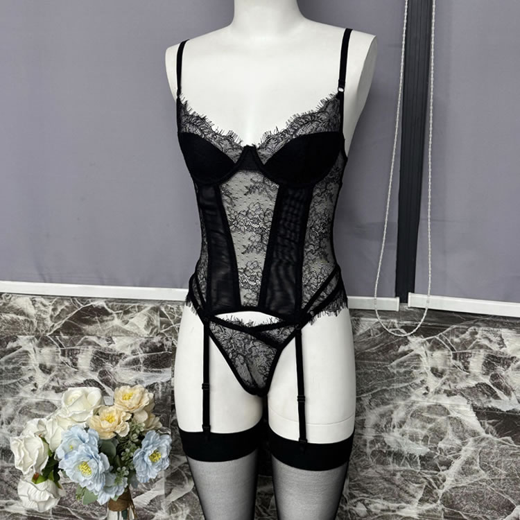 This striking black chemises combines the shaping power of a corset with the allure of delicate lace. The front features underwire cups framed by floral lace trim, while vertical mesh panels and satin-like bands create a cinched waist effect for a defined hourglass shape. Adjustable shoulder straps and functional garters connect to matching thigh-high stockings for a complete look. The back reveals a bold open cutout bordered with smooth elastic trim, adding modern drama to this classic-inspired piece. Designed to flatter and empower, it’s ideal for those who appreciate structured intimacy wear.