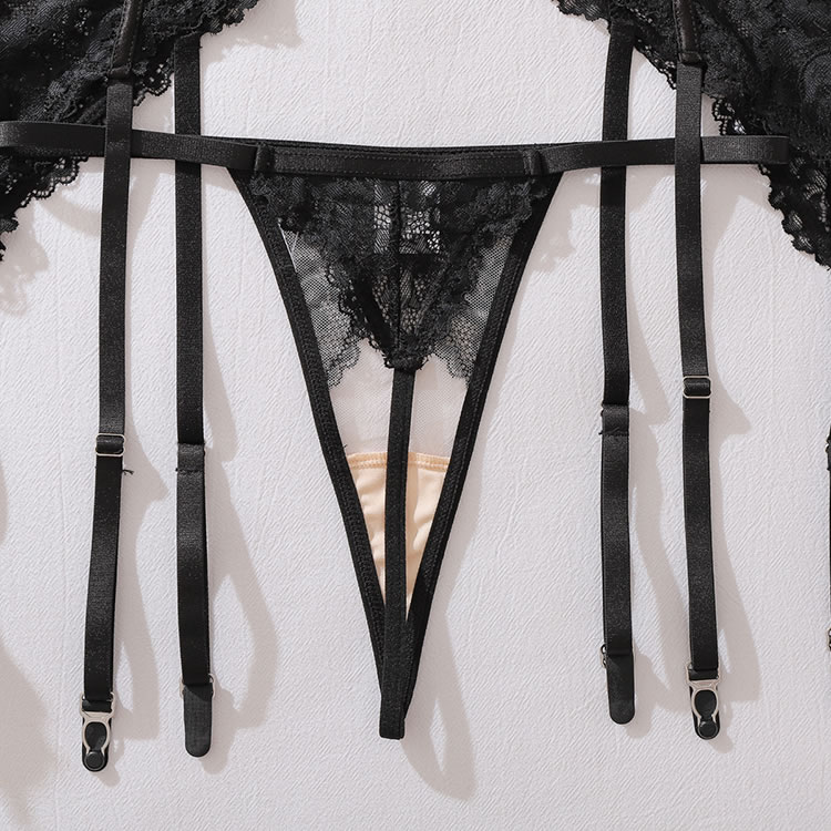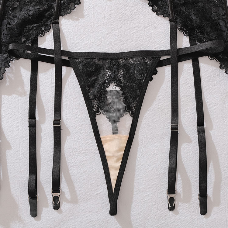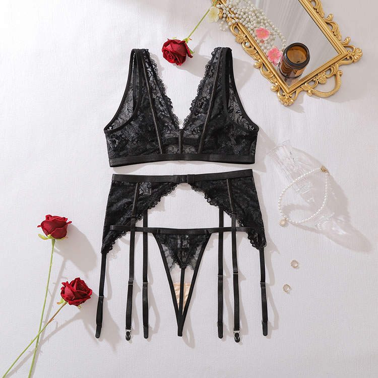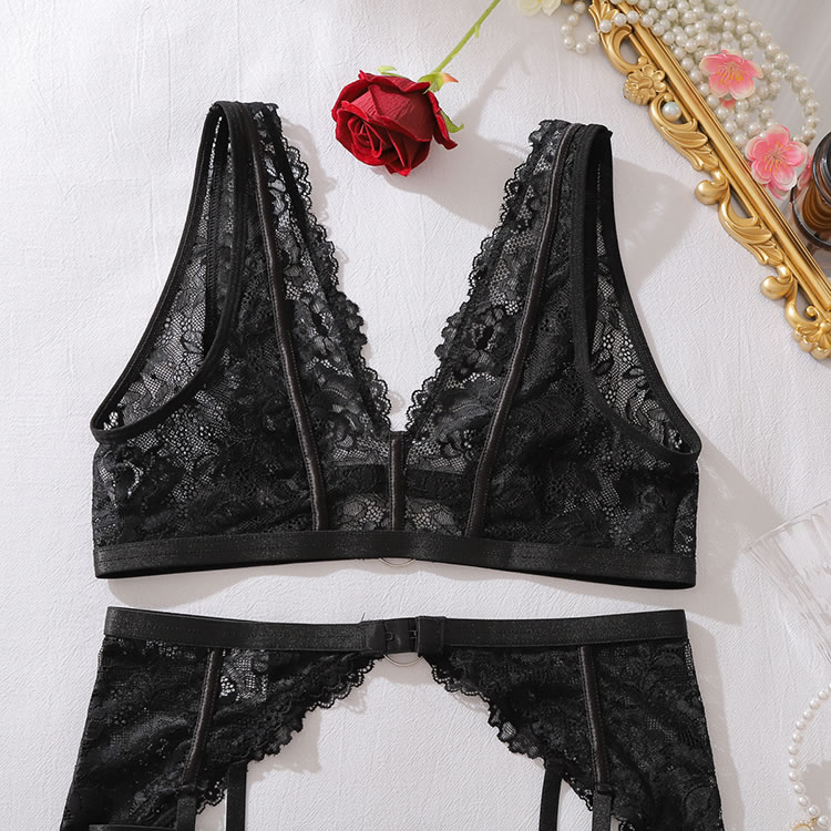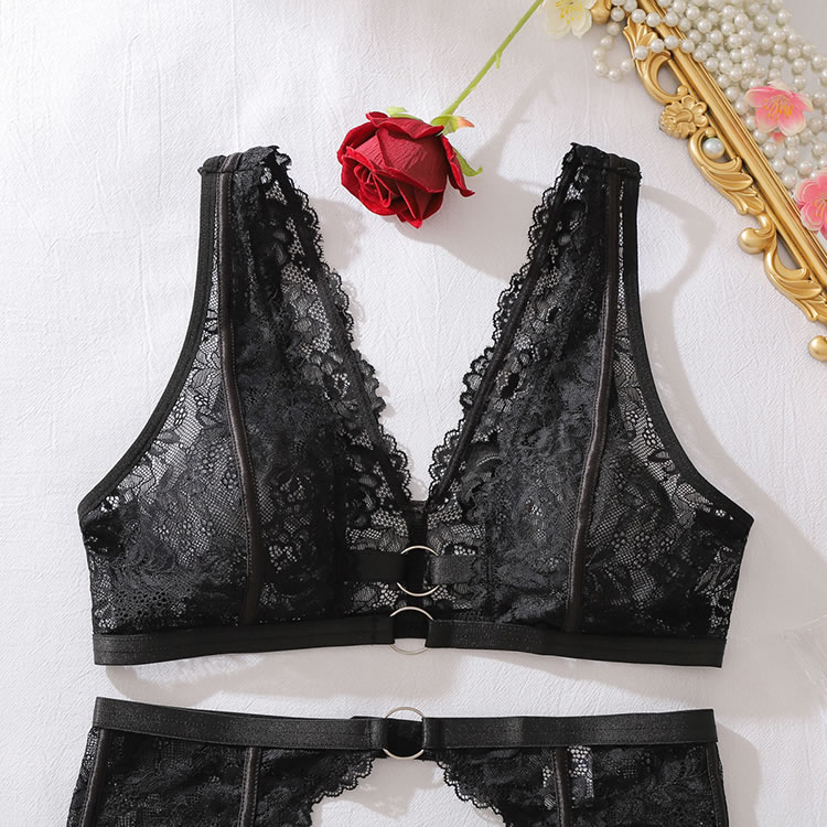 Command attention with this daring black lace lingerie set featuring a deep V-neck bra and matching high-cut bottoms. The intricate floral lace creates a romantic yet edgy aesthetic, while the strategically placed metal rings and garter straps offer a customizable, bold look. The open back design of the bra ensures a comfortable fit while highlighting the natural curves of the back and shoulders. This versatile ensemble is designed for those who want to make a confident statement.