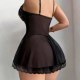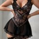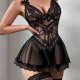 This black lace lingerie dress features a deep V-neckline with floral-patterned lace and small bow details on the straps and center front. The bodice is structured with sheer panels and intricate embroidery, creating a bold silhouette. A flared skirt flows from the waist, trimmed with scalloped lace along the hem. It offers a classic yet daring look. Designed to highlight curves, it combines delicate lace with smooth fabric for a balanced contrast.