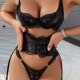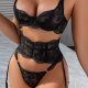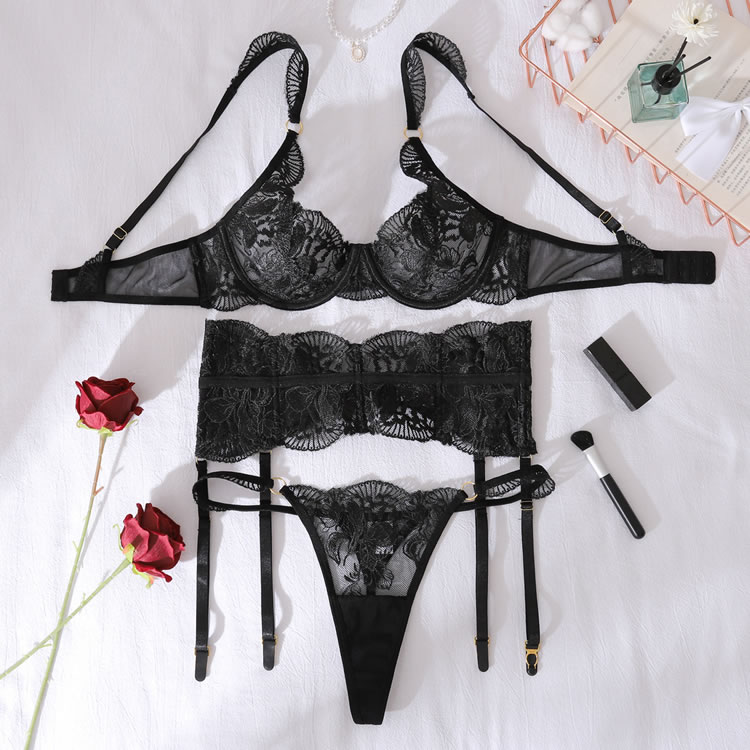 This striking lingerie set combines classic lace detailing with modern edge. The bra features full coverage cups with intricate floral patterns and thin adjustable straps, while the matching waist panel wraps tightly around the midsection with a scalloped lace trim. Paired with a thong and attached garters, it creates a cohesive look that highlights curves with confidence and drama—perfect for those who love bold, statement-making undergarments.