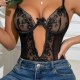 This bold black bodysuit combines sheer mesh with intricate floral lace detailing for a look that’s both daring and refined. Featuring a deep plunging neckline with a bow accent at the center, it highlights the bust while maintaining structure through underwire support. The thin adjustable straps and open back design add a touch of elegance, while the high-cut leg line enhances curves. Designed to flatter the silhouette, it's perfect for intimate moments or making a statement when worn under a dress or jacket.