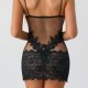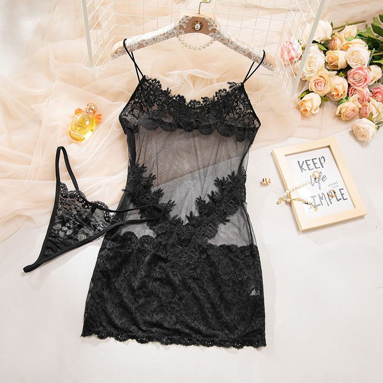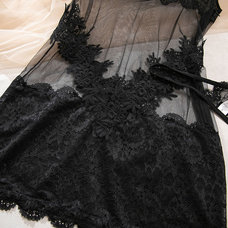 This alluring black lace lingerie set features a sheer mesh silhouette with bold floral lace detailing that highlights your curves in a seductive way. The spaghetti strap design offers a delicate frame, while the intricate lace trim along the bust and hem adds texture and charm. The high-cut skirt-style bottom combines transparency with ornate embroidery, making it perfect for intimate moments or adding a touch of romance to your evening routine.