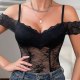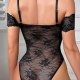 This black lace bodysuit features an off-the-shoulder design with delicate floral lace panels that extend from the neckline to the arms, creating a soft yet bold look. The structured bust is framed by thin spaghetti straps, while the torso is crafted from sheer mesh with intricate lace patterns that follow the natural curves of the body. A central seam runs down the front, enhancing the waistline, and the high-cut leg openings offer a sleek, elongated silhouette. Designed for confidence and flair, this one-piece is ideal for intimate moments or evening wear.