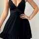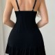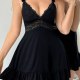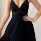 This sleek black slip-style dress blends soft fabric with delicate lace detailing for a bold yet feminine look. Featuring a deep V-neckline with floral lace trim and ruffle-accented straps, it creates a flattering silhouette. The flared skirt adds movement and charm, making it ideal for intimate moments or as a statement piece in your loungewear collection.
