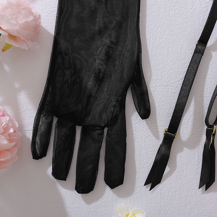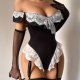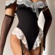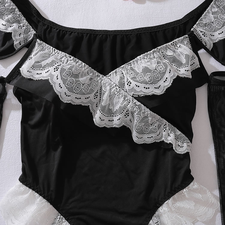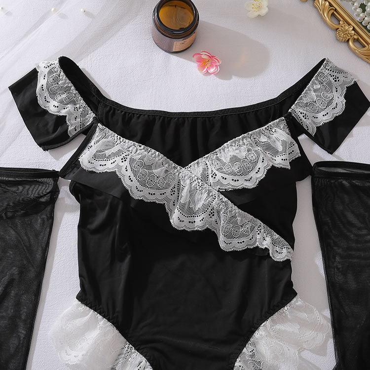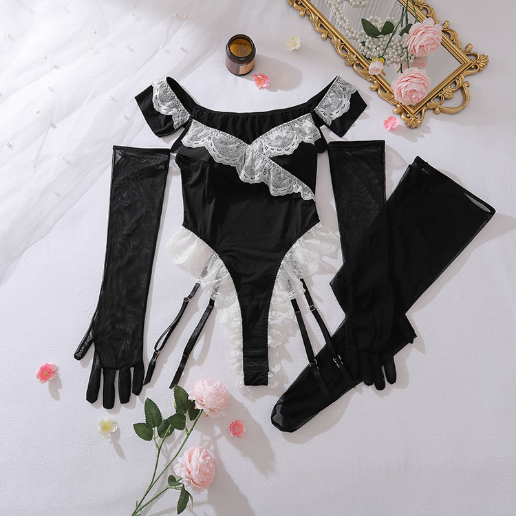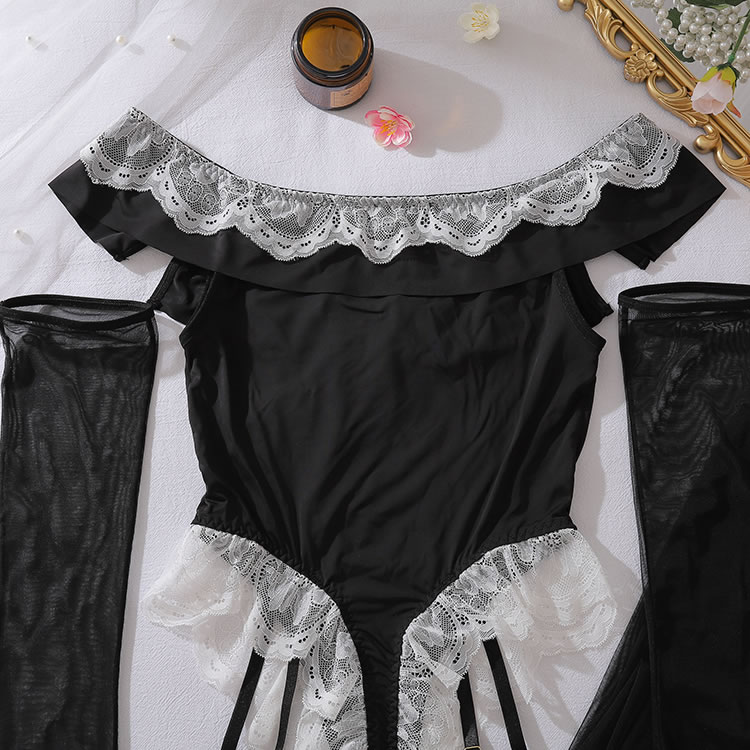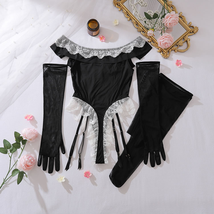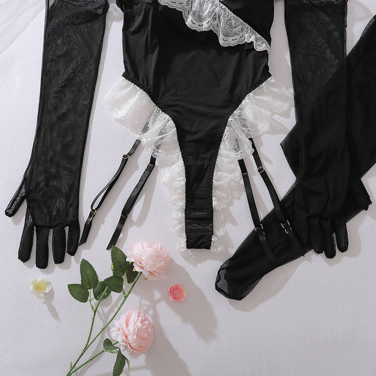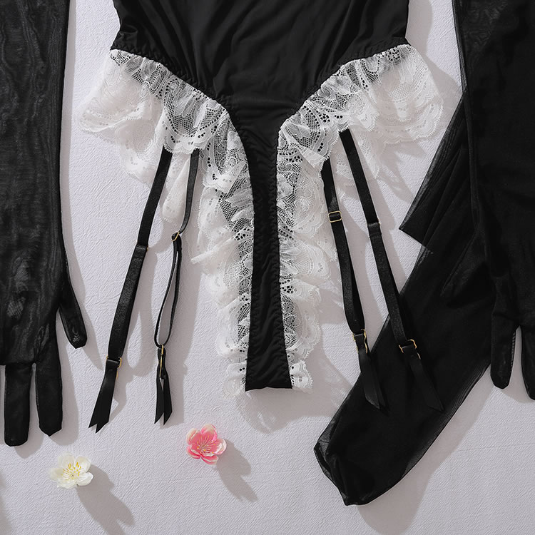 This all-in-one lingerie set is designed to captivate, featuring a form-fitting black teddy with delicate white lace trim along the sweetheart neckline and leg openings. The set includes matching sheer, full-length gloves that add a layer of elegance and mystery. Complete with attached garter straps and sheer thigh-high stockings, this ensemble offers a classic yet daring look that is perfect for a special night.