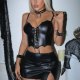This bold black two-piece set features a structured corset-style top with front lacing and thin adjustable straps. The material has a smooth, shiny finish that gives it a sleek, edgy look. Paired with a high-waisted mini skirt that includes a side slit and belt detail, this outfit is designed to make a statement. Perfect for themed events, parties, or daring fashion choices.