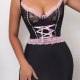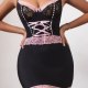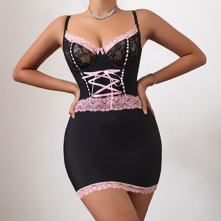 This striking black lingerie dress combines edgy design with sweet feminine details. The top features a lace-trimmed bustier with a deep V-neckline and delicate pink accents that add contrast and charm. A corset-style lace-up panel at the front draws attention to the waist, creating a defined silhouette. The smooth, form-fitting skirt hugs the curves perfectly and is finished with a soft pink lace hem, blending sensuality with playful elegance. Ideal for intimate moments or making a confident statement.