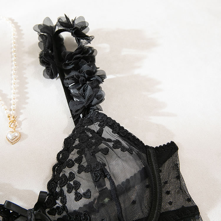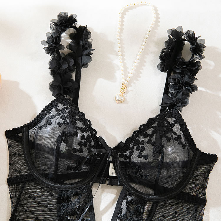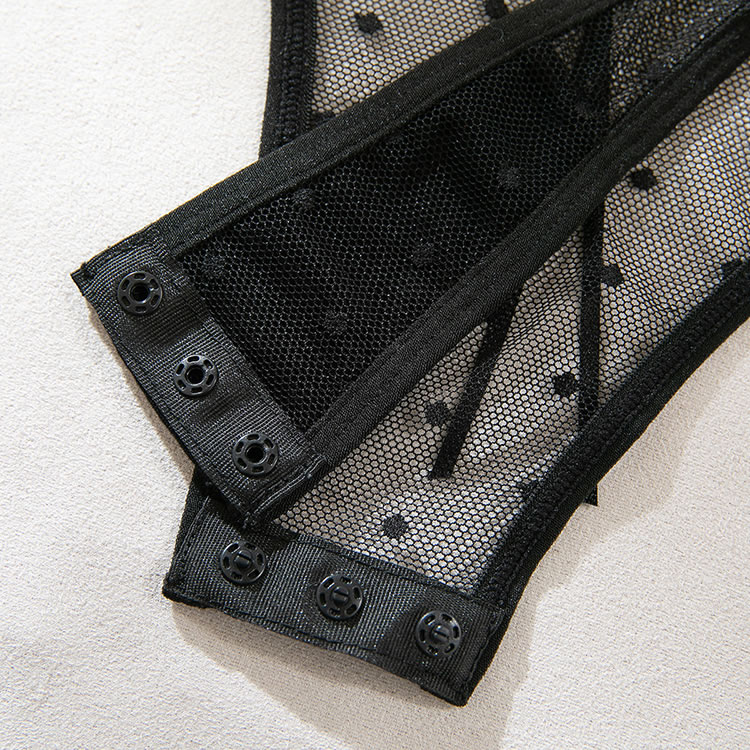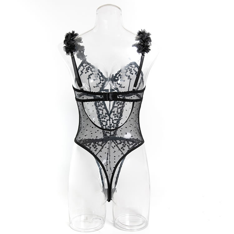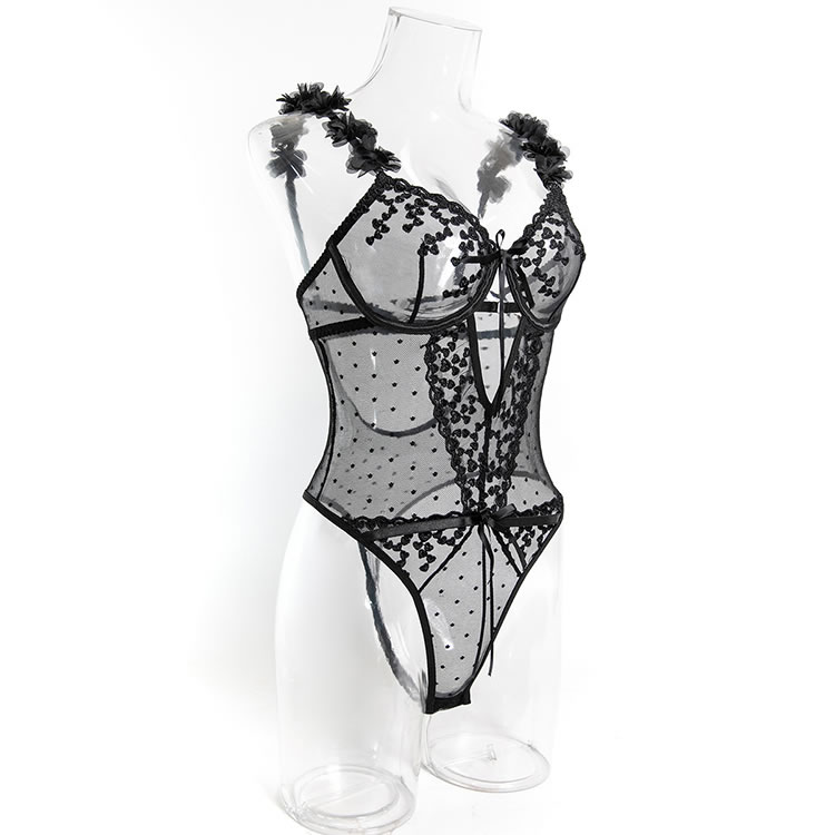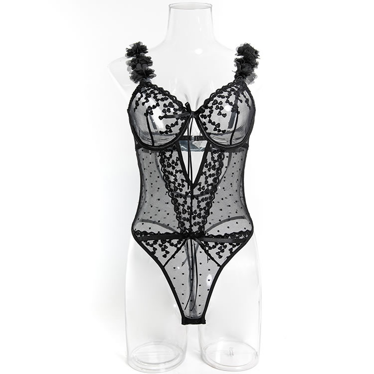 This black mesh bodysuit features a delicate floral lace design with ruffled shoulder accents that add a touch of drama. The front includes a deep V-cut with a bow detail, while the back showcases an open circular cutout for a bold silhouette. Crafted with sheer polka-dot fabric and reinforced edges, it’s designed to make a statement with every movement—perfect for those who love expressive, fashion-forward lingerie.