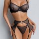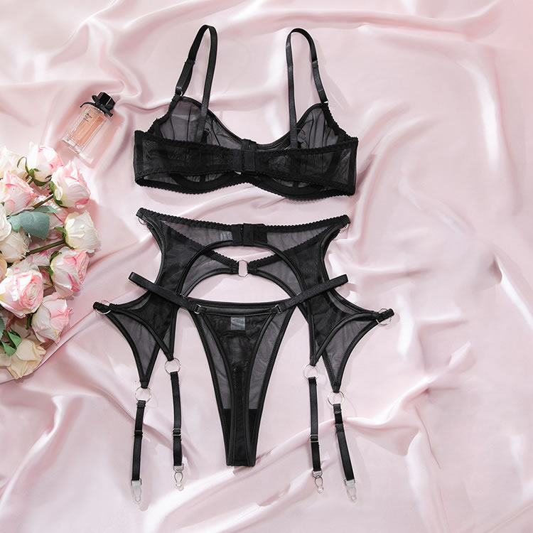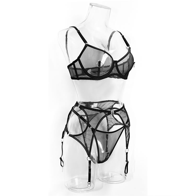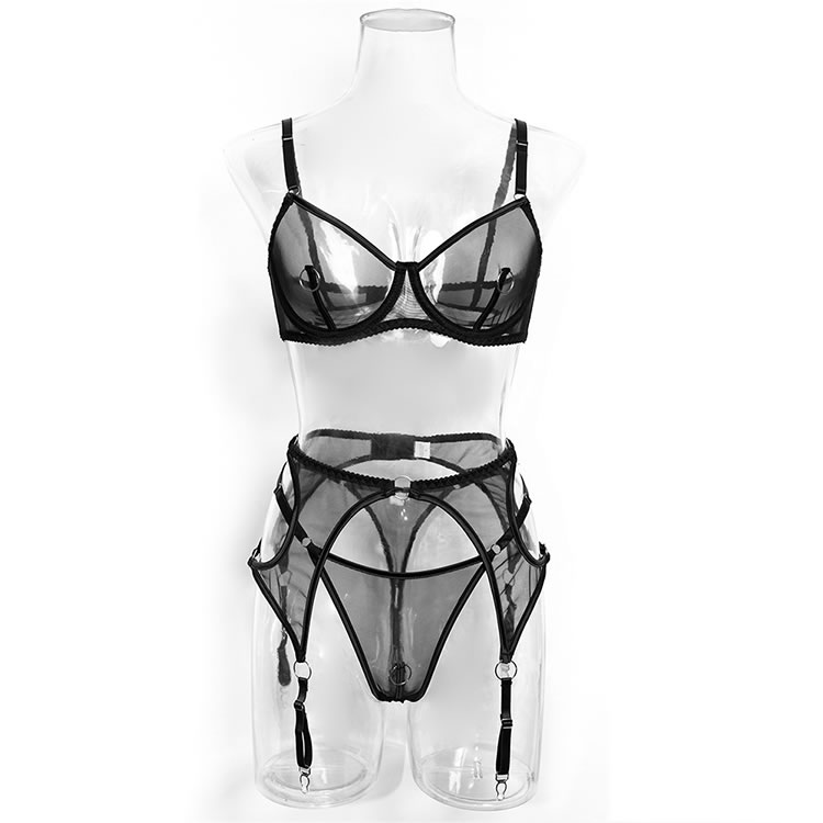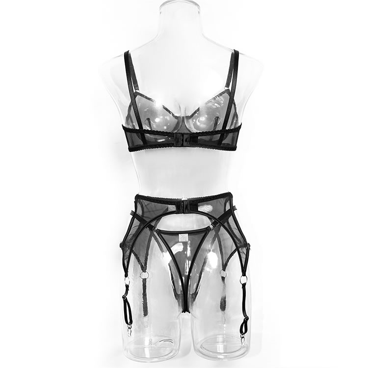 Make a powerful statement with this edgy black lingerie ensemble that blends transparency with strong lines. The push-up bra offers support with a sleek mesh finish and circular hardware details, while the attached garter system wraps around the hips and thighs for a connected, sculpted look. The back is designed with thin straps and an open cutout, enhancing both shape and allure. Ideal for bold fashion choices or intimate moments with attitude.