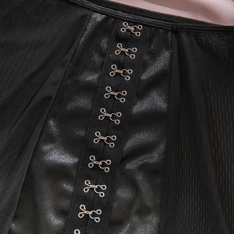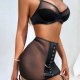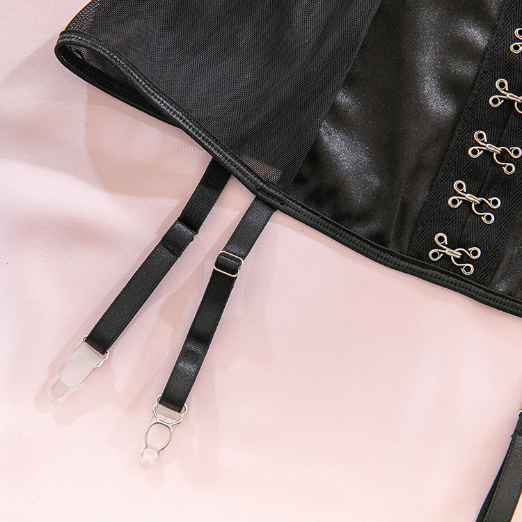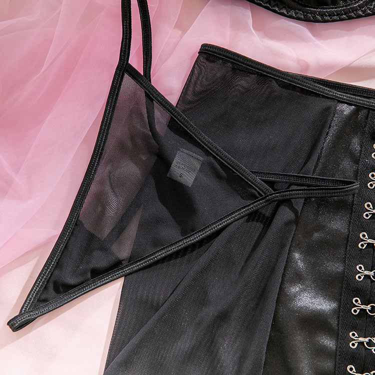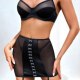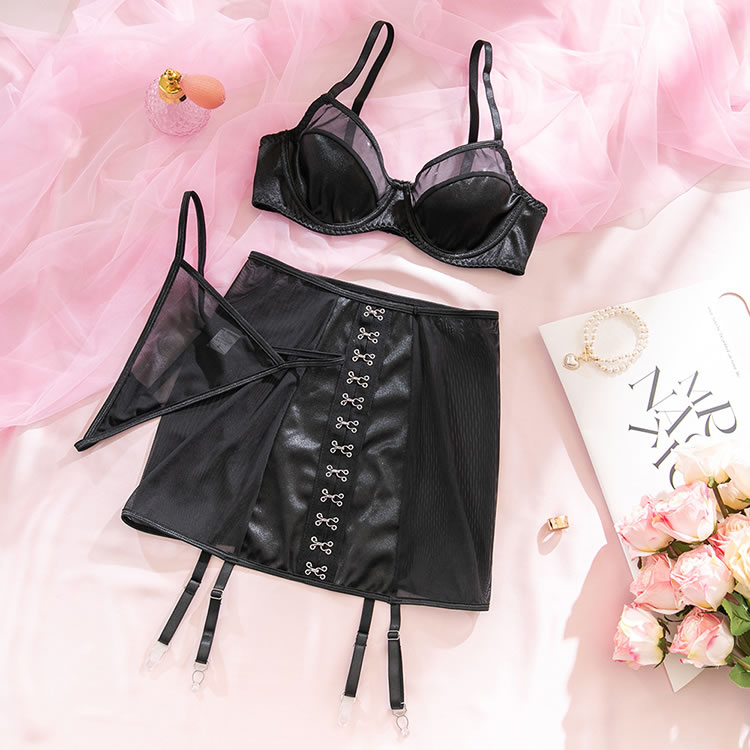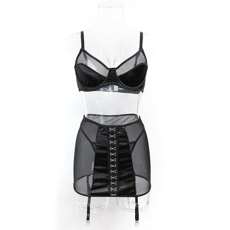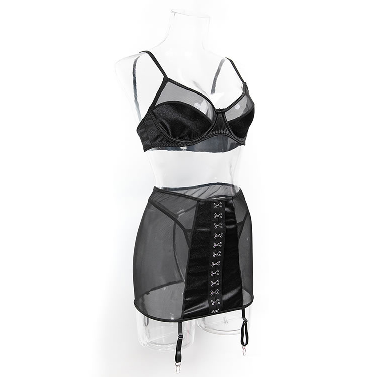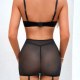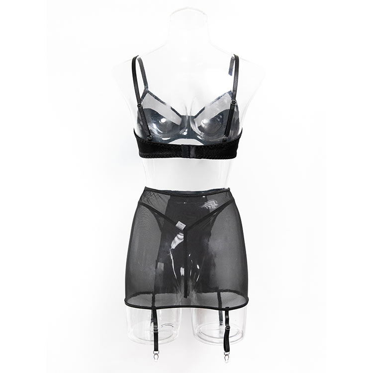 This black lingerie set includes a supportive bra with a mesh front and solid underwire cups that offer structure and shape. The thin straps and clean back closure create a sleek look that highlights the shoulders and spine. Paired with a high-waisted mini skirt made from sheer mesh, it features a central panel with decorative stitching and side garter clips that add a vintage-inspired touch. The skirt hugs the hips and thighs, offering a flirty yet edgy silhouette perfect for those who enjoy a blend of sensuality and modern style.