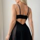 Designed with a mix of opaque and sheer materials, this black slip dress blends structure and transparency. The lace-trimmed mesh inserts run down the sides, offering a peek-a-boo effect that highlights the figure. A soft ruffle at the back waistline adds texture, while thin adjustable straps ensure a comfortable fit. With its flared hem and elegant cut, it’s perfect for those who enjoy a dramatic yet feminine look.