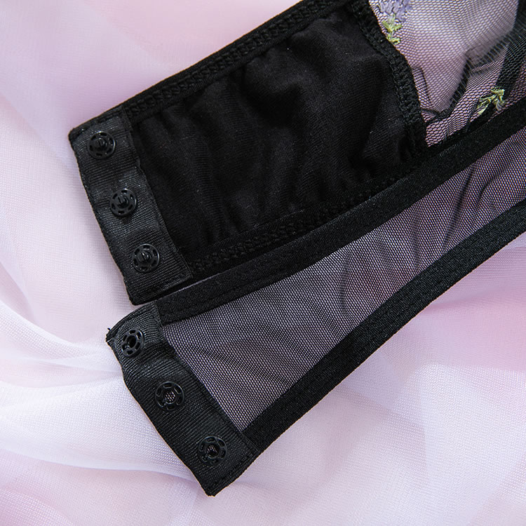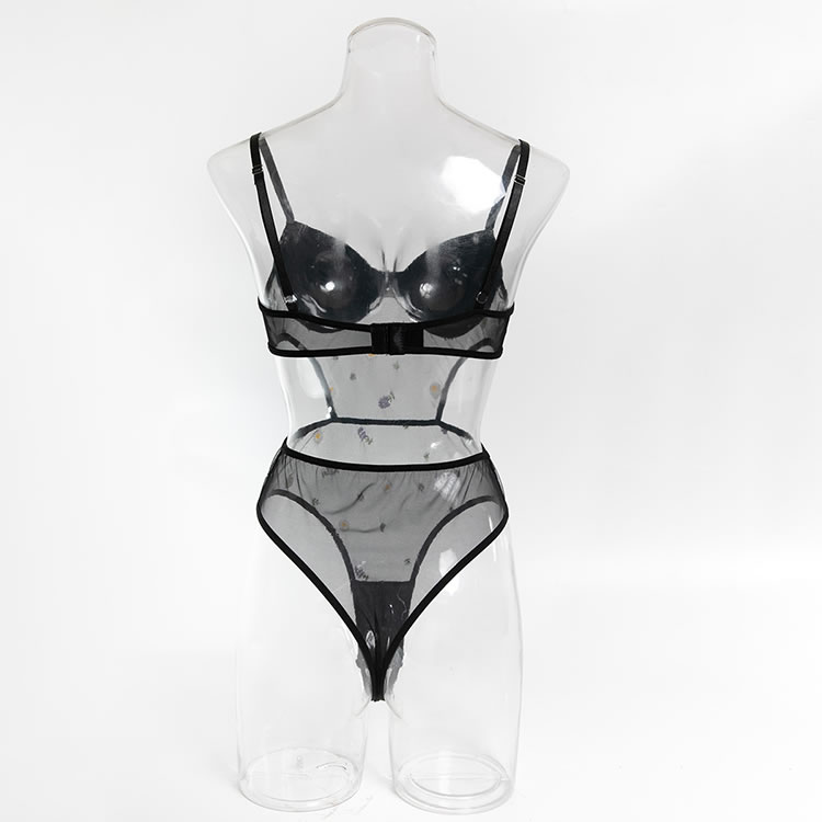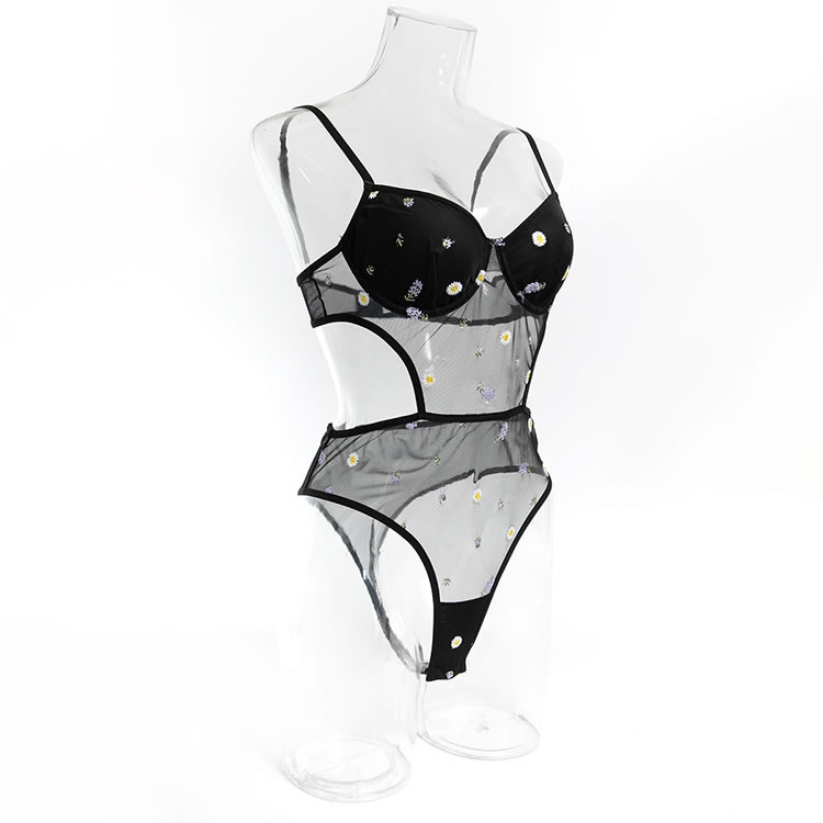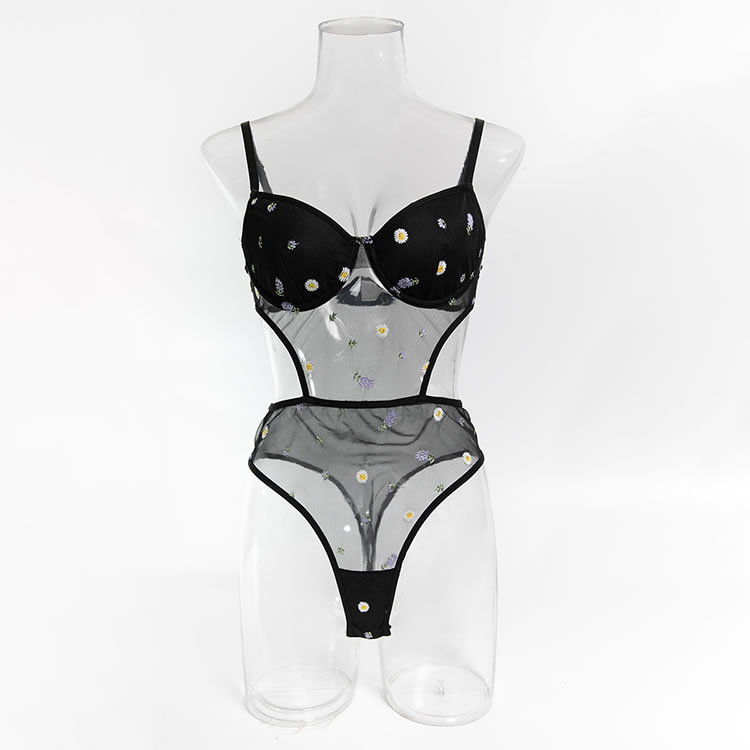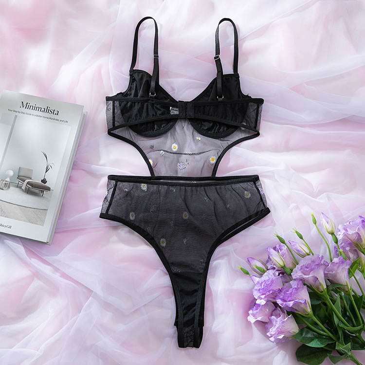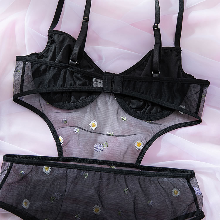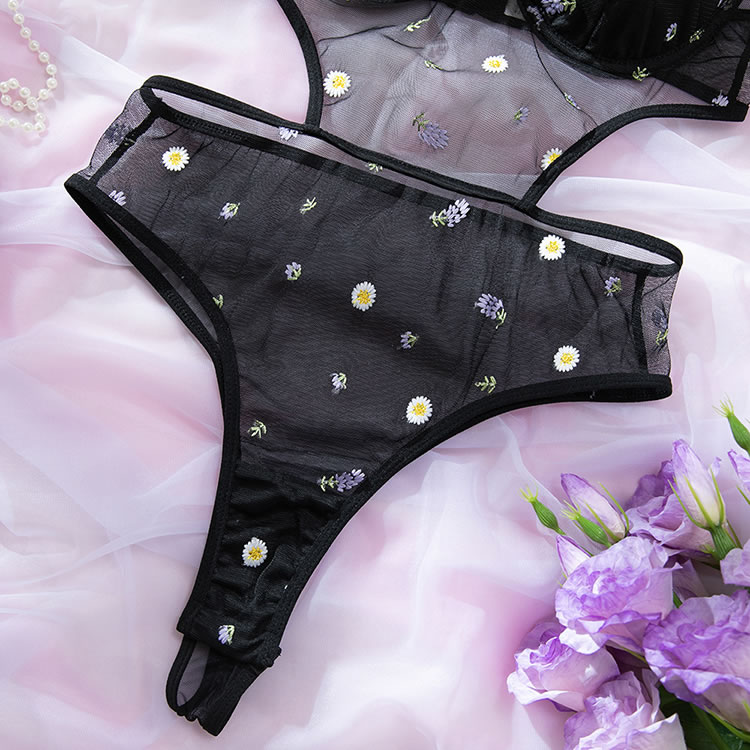 This bold black lingerie set blends sheer mesh fabric with delicate embroidered flowers for a unique blend of edgy and romantic style. The bra features structured underwire cups with solid black fabric at the top, accented by small daisy and leaf motifs that extend across the mesh panel. The back is finished with thin straps and a central clasp, offering secure support. The matching high-cut thong includes side cutouts and a seamless waistband, creating a sleek silhouette. Designed to highlight curves, it’s perfect for those who love a mix of transparency and playful detail.