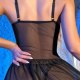 This eye-catching black corset bodysuit combines sleek PVC-like material with intricate lace inserts for a daring look. Featuring a structured front, thin shoulder straps, and a flared sheer skirt panel, it offers both form and flair. Paired with a matching thong and strappy detailing, this piece is perfect for those who love bold silhouettes and dramatic style.