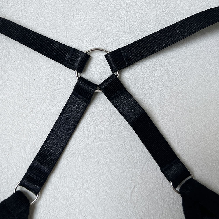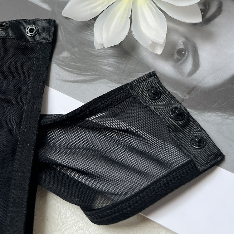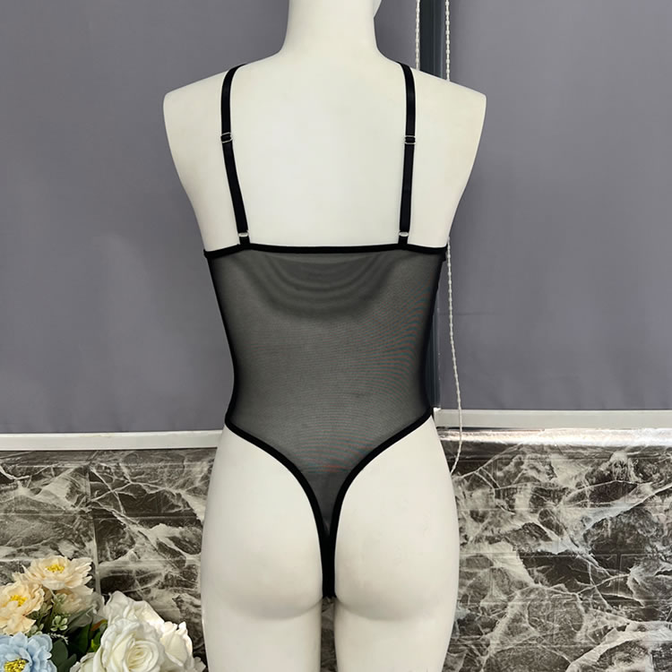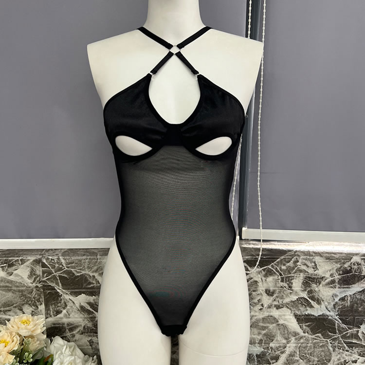 This bold black bodysuit blends daring cutouts with sultry sheer mesh for a look that’s both modern and magnetic. The halter-style neckline crosses at the collarbone, while strategic openings frame the bust and waist. It’s designed to turn heads — whether you’re dressing up for a night out or embracing confidence in private. (Thigh high stockings and gloves not included.)