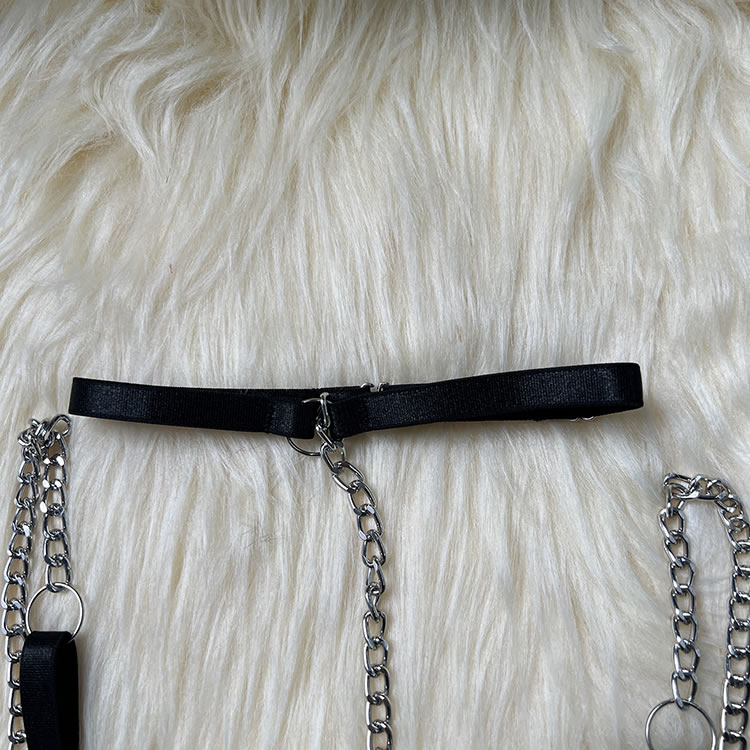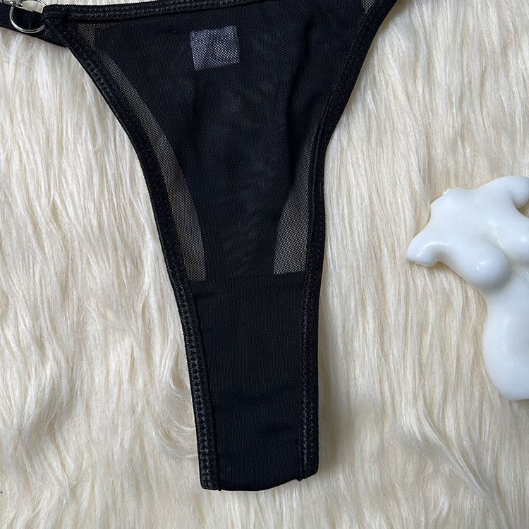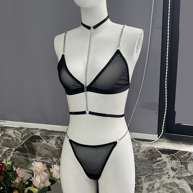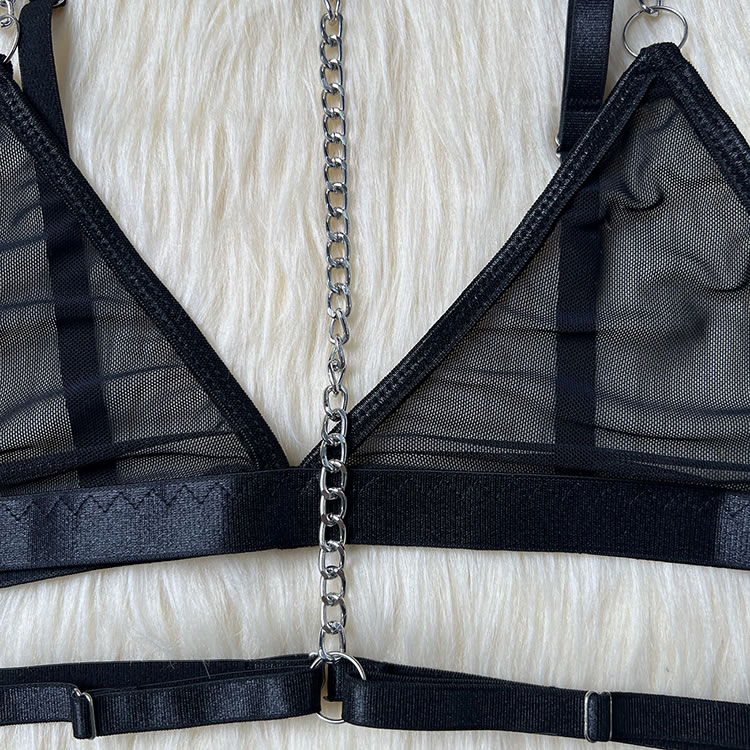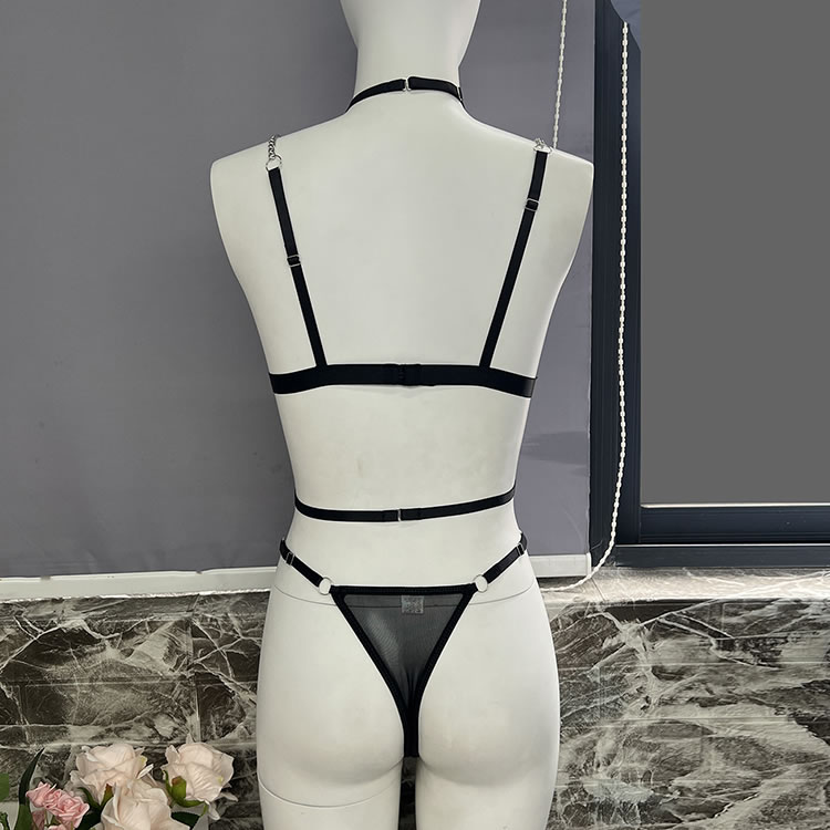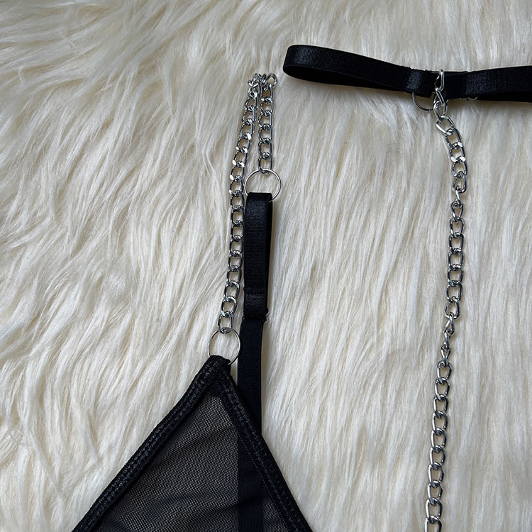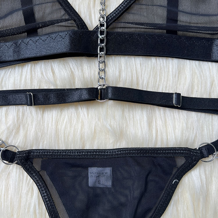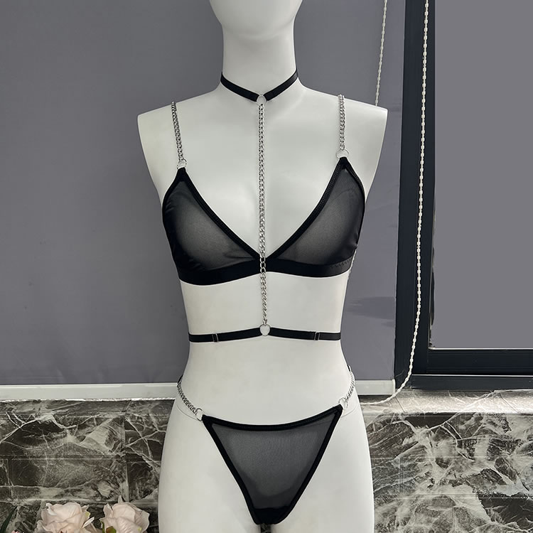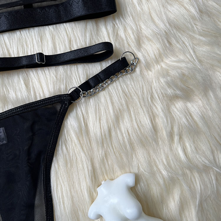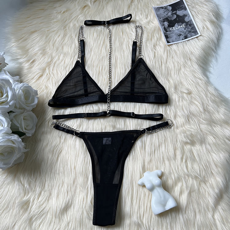 Make a statement with this striking lingerie set that combines boldness with elegance. The bra features sleek straps and a unique chain detail that adds an edgy touch, while the sheer fabric offers a hint of allure. The matching thong is designed for comfort, with a soft waistband and a stylish cutout at the back. Perfect for those who love to stand out and embrace their confident side.