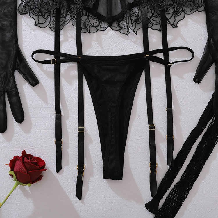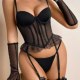 Embrace timeless seduction with this elegant black bustier set. Designed to flatter your silhouette, the structured bustier features a sheer mesh panel detailing, creating a captivating hourglass shape. Delicate lace trim adorns the waistline, adding a touch of romantic texture. The set is completed with matching thong, adjustable garter straps for your favorite stockings, and sophisticated sheer opera gloves for a truly polished and alluring look.