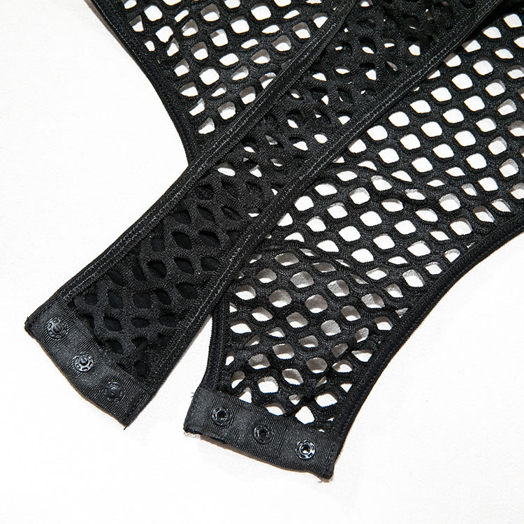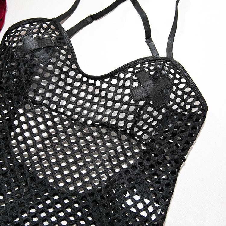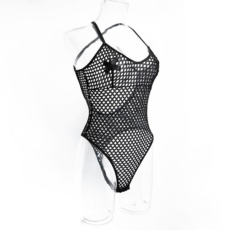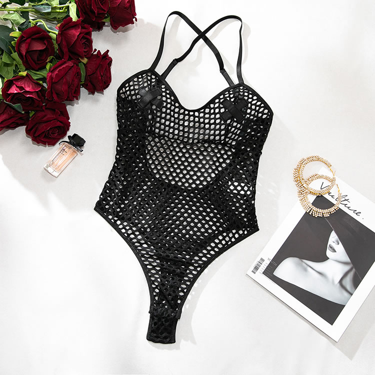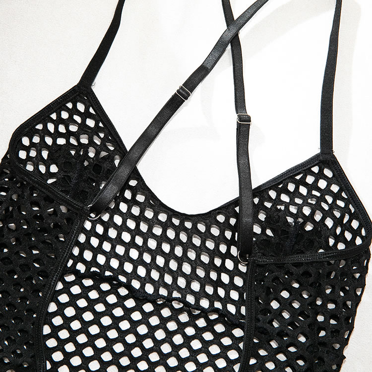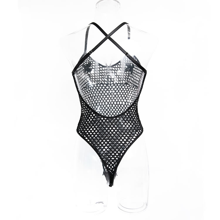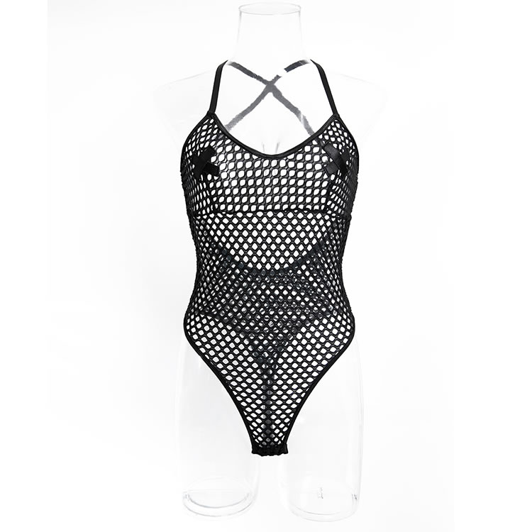 Embrace a bold, athletic-inspired aesthetic with this black fishnet teddy. Featuring a distinctive cross emblem on the chest, this one-piece combines streetwear vibes with intimate apparel. The wide-mesh netting offers a completely sheer look, while the crisscross strappy back adds a dynamic visual element. With a high-cut leg design, this teddy elongates the silhouette, making it a daring choice for those who want to make a statement.