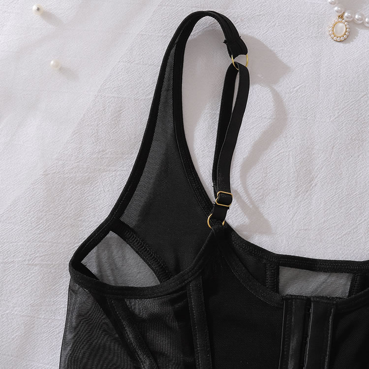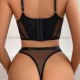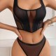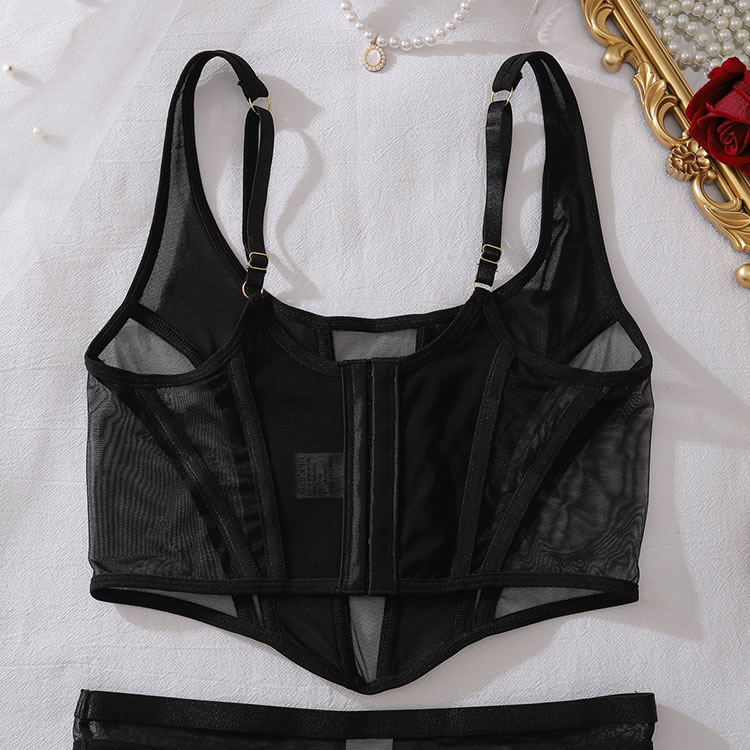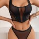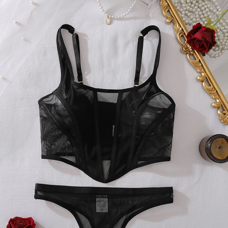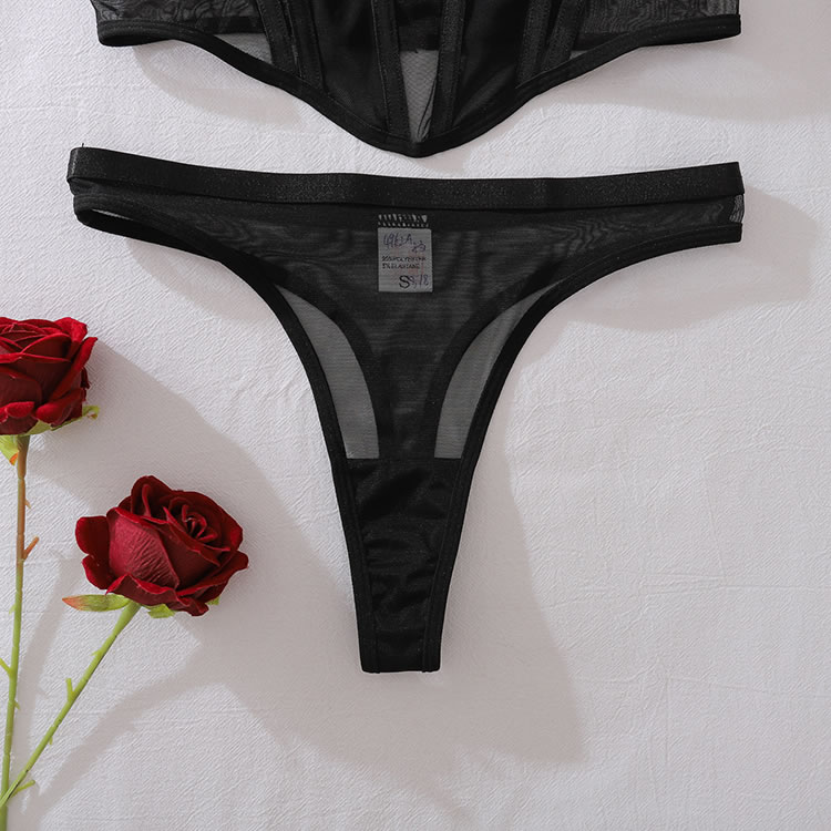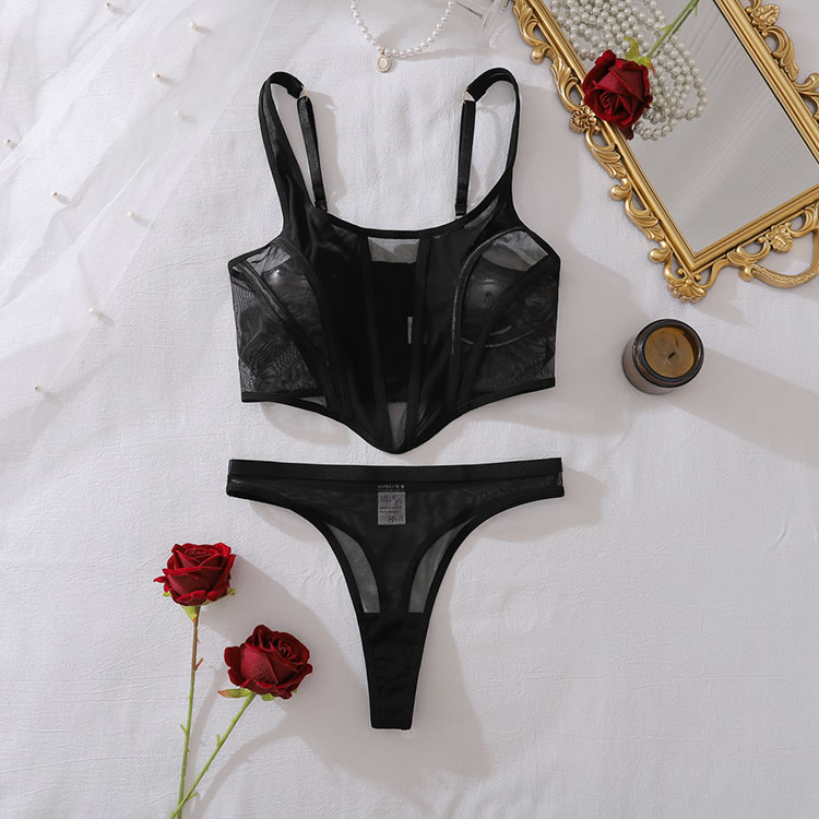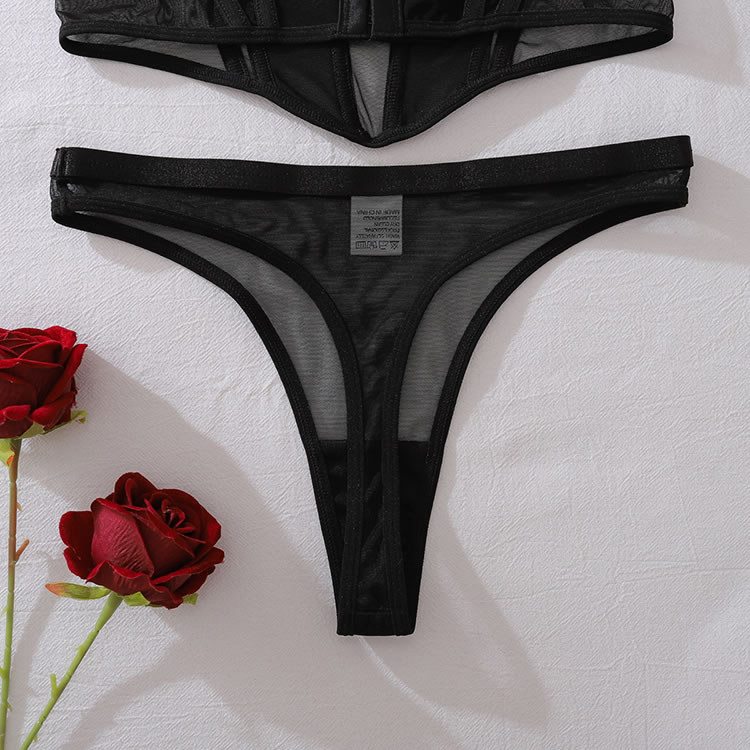 This contemporary two-piece set makes a bold statement with its daring design. The bra features a deep plunge neckline framed by opaque panels, creating a striking contrast with the sheer mesh sides. Paired with matching high-cut thong bottoms, this ensemble is defined by clean lines and minimalist appeal. Adjustable straps and a secure back closure ensure a comfortable and confident fit.
