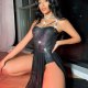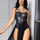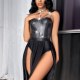 This daring bodysuit blends modern style with seductive details. Crafted with a form-fitting snake top and a high-leg cutout, it’s designed to turn heads. The attached sheer panel drapes elegantly from the waist, enhancing movement and drama. Ideal for those who love to express confidence and individuality through bold fashion choices.