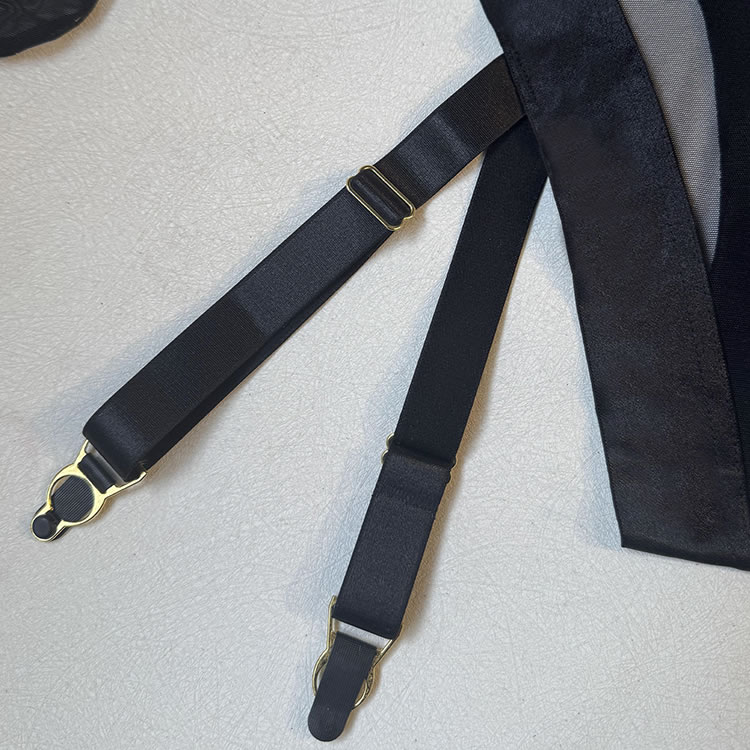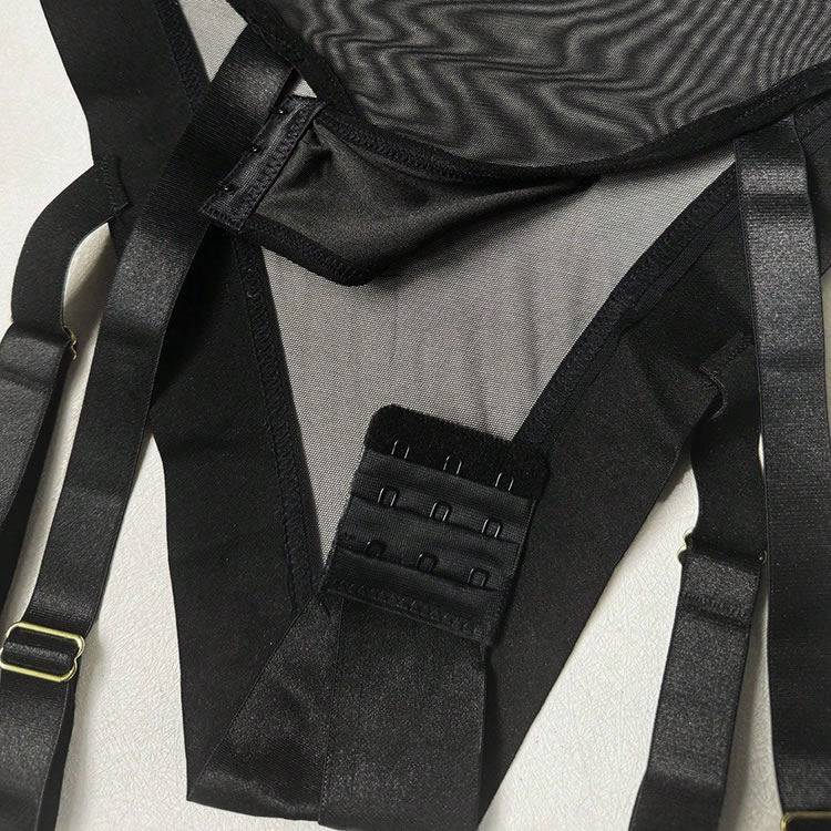 This sleek strapless bodysuit offers a bold yet refined look with its semi-sheer mesh body framed by smooth satin bands at the bust, waist, and leg openings. The seamless construction creates a streamlined silhouette that hugs the curves without interruption. Functional garter straps with gold-tone hardware attach to matching thigh-high stockings for a complete, polished ensemble. Perfect for those who appreciate clean lines and understated sensuality in their intimate wear.